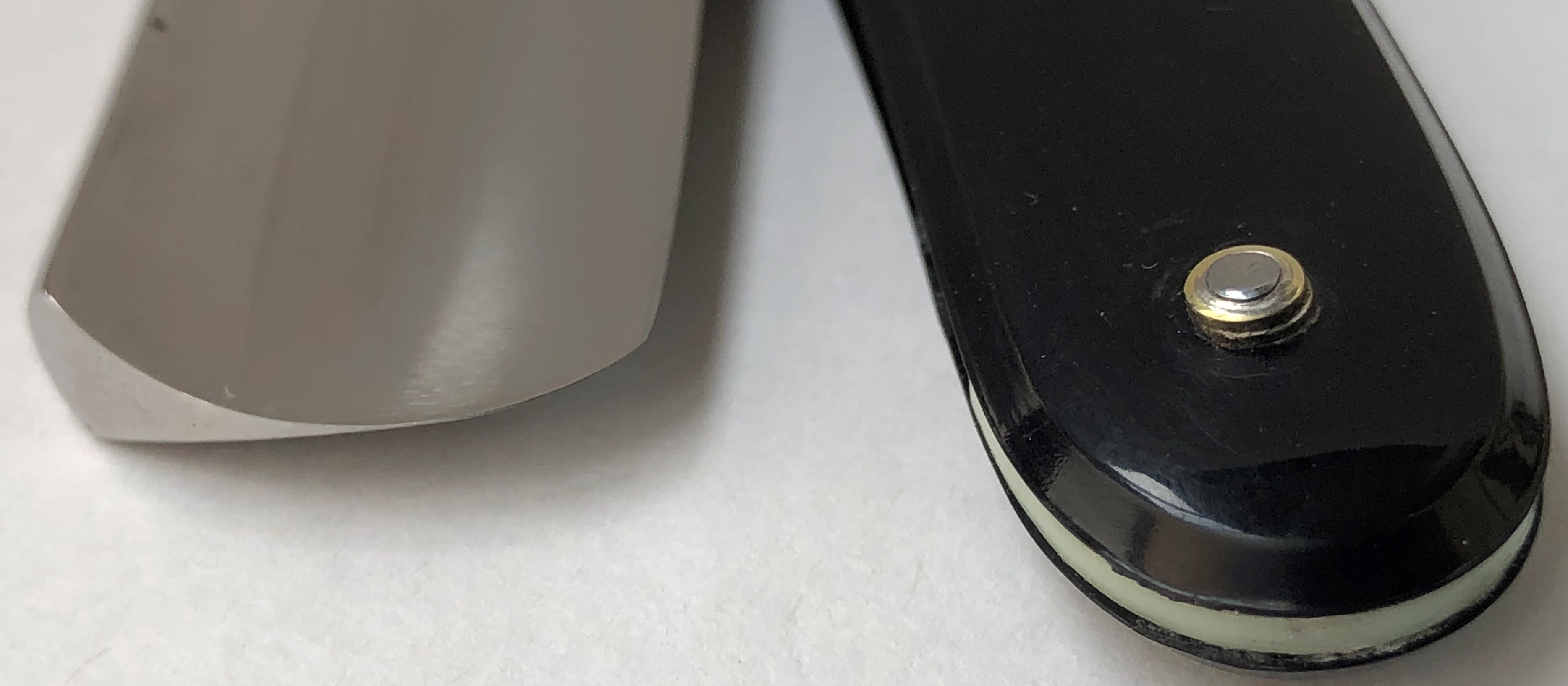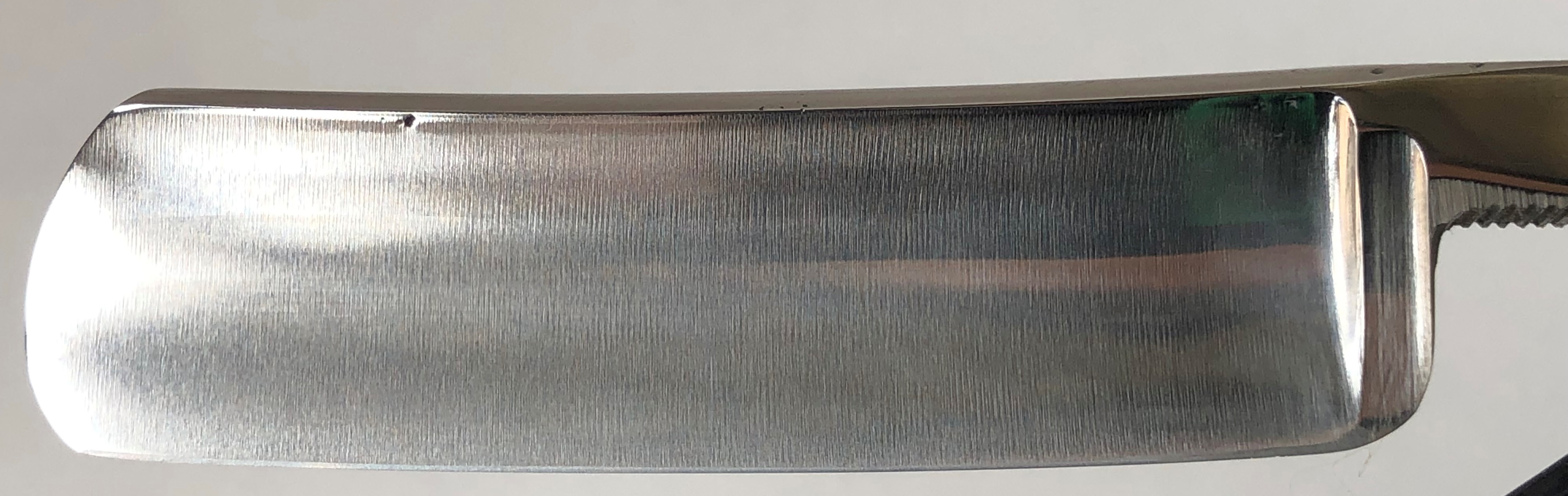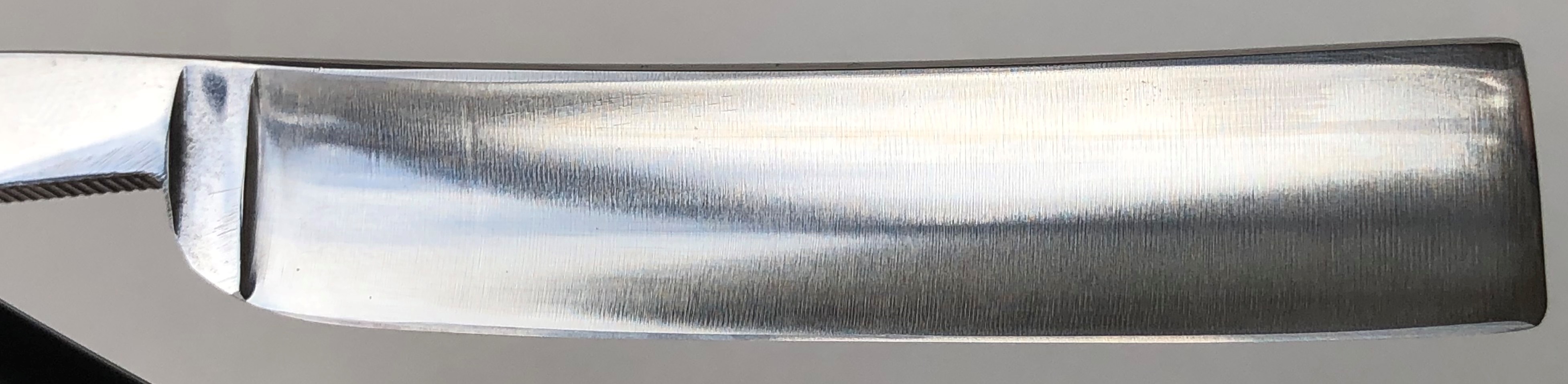 Бритва в пользовании не была, но нуждалась в чистке и полировке. Небольшое количество "следов времени" осталось, но никоим образом не повлияют на дальнейшую эксплуатацию.Комбинированная продольно-поперечная шлифовка.Новые втулки и внутренние шайбы. Идеальная геометрия полотна:кромочка равномерна по всей длине и еле заметна.