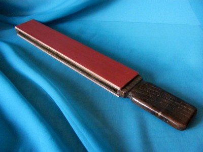 Материал: Древо-дуб, поверхность обработана карнаубским воском. Кожа: чистая сторона-американская корова, пастированная -корова СССР. Размеры: длина рабочей поверхности 27 см, ширина 4.5 см. Цена : 40 евро. Продан Доставка: Украина за мой счет, СНГ + 5 евро.