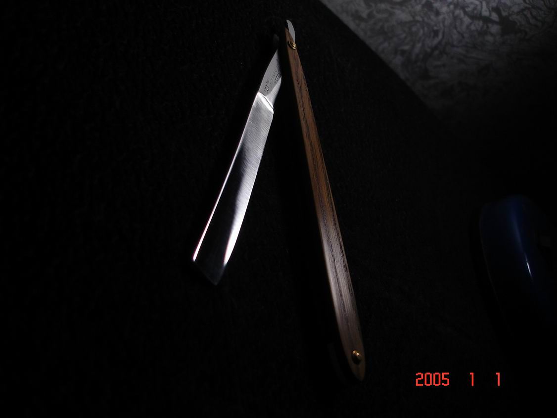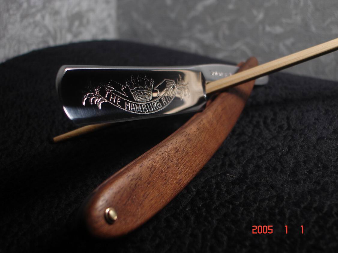 Скорее всего бритва в пользовании не была ,заводская шлифовка , бритва была разобрана , отполирована , ручка восстановлена , дополнил конструкцию шайбочками на осевом пине , что бы избежать трения ручки о полотно бритвы .