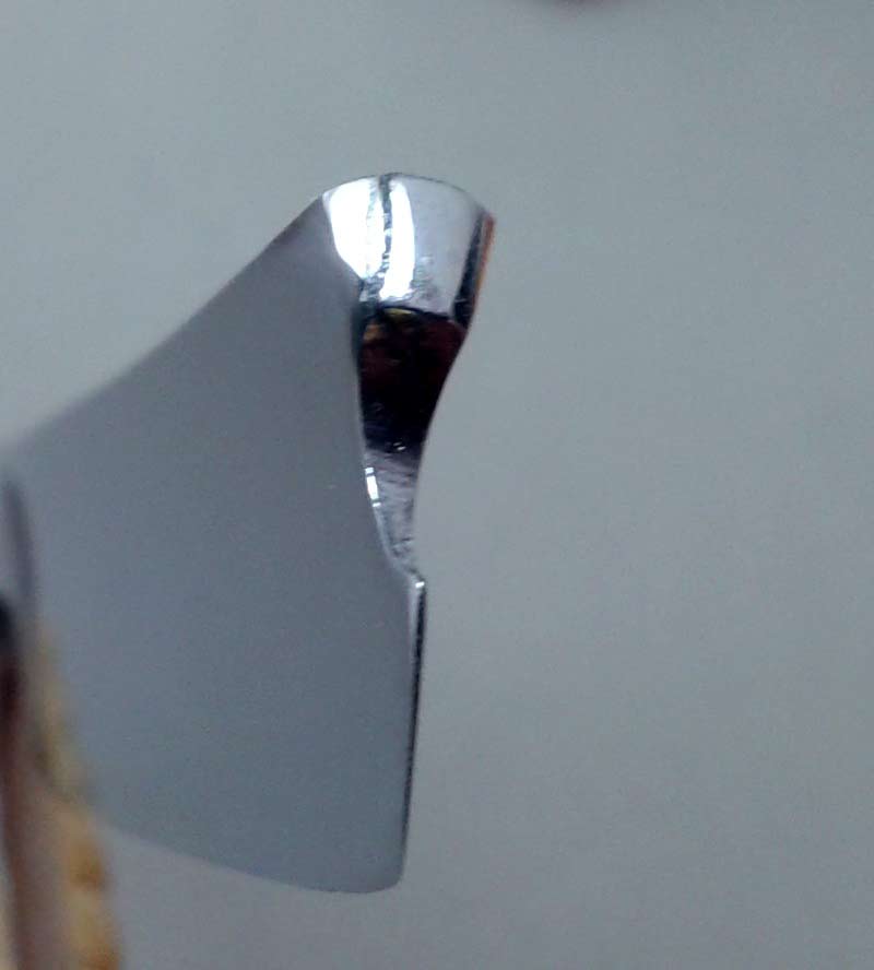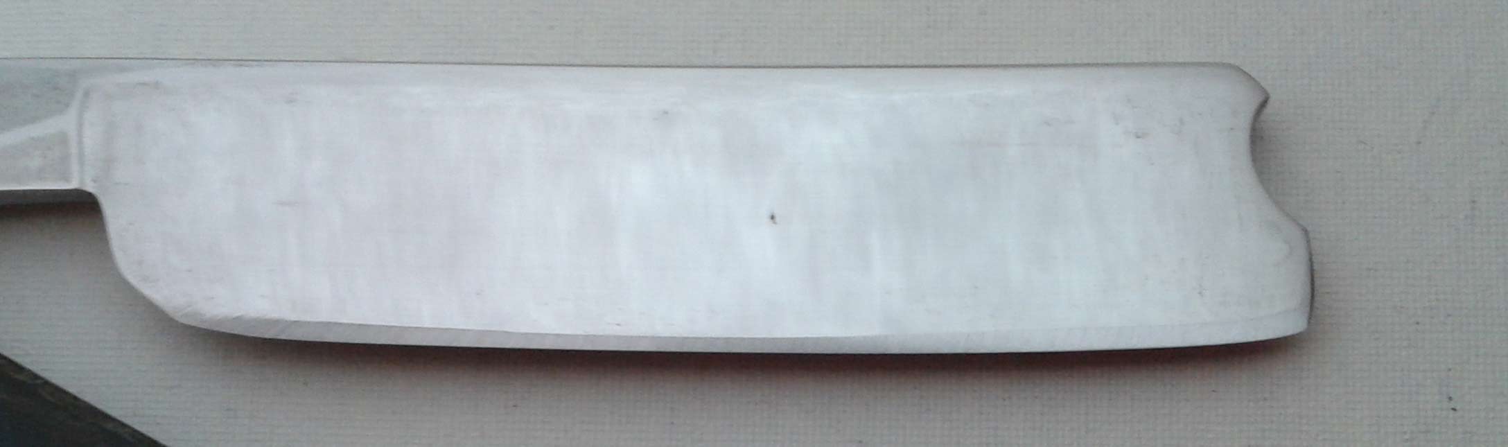 Ручка - целлулоид, в отличном состоянии. Бритва, по-видимому, почти или совсем не точилась после завода, полотно в заводской геометрии. На головке имеется трещинка на обушке (видна на фото). Трещинка не глубокая - примерно 1 мм глубиной, при нормальной эксплуатации проблем не создаст. Заточена и полностью готова к бритью. Ширина полотна 18,5 мм, толщина в обушке 5,5 мм. Цена 75 евро, доставка включена.