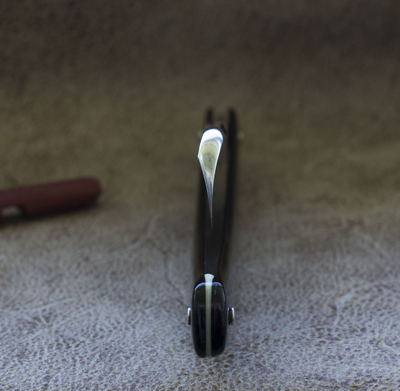 Опасная бритва японского производства. Новая неиспользованная бритва 50, 60-х годов, ширина 6/8, имеет схожую с камисори форму полотна и ассиметричную спинку, но в отличие от камисори точатся эти бритвы как обычные европейки, камень оставляет с двух сторон равномерную узкую фаску, что придает им более эстетический вид, а рукоять и эрль с выемкой под палец дают возможность пользоваться ей как обычной европейской бритвой, к тому же менее длинное чем у большинства европеек полотно дает лучший контроль и удобство в бритье, сочетает в себе лучшие качества камисори и европейских холлоу граундов. Посмотрите на фото носика чтобы увидеть ассиметричное строение полотна. Продано Spoiler Show