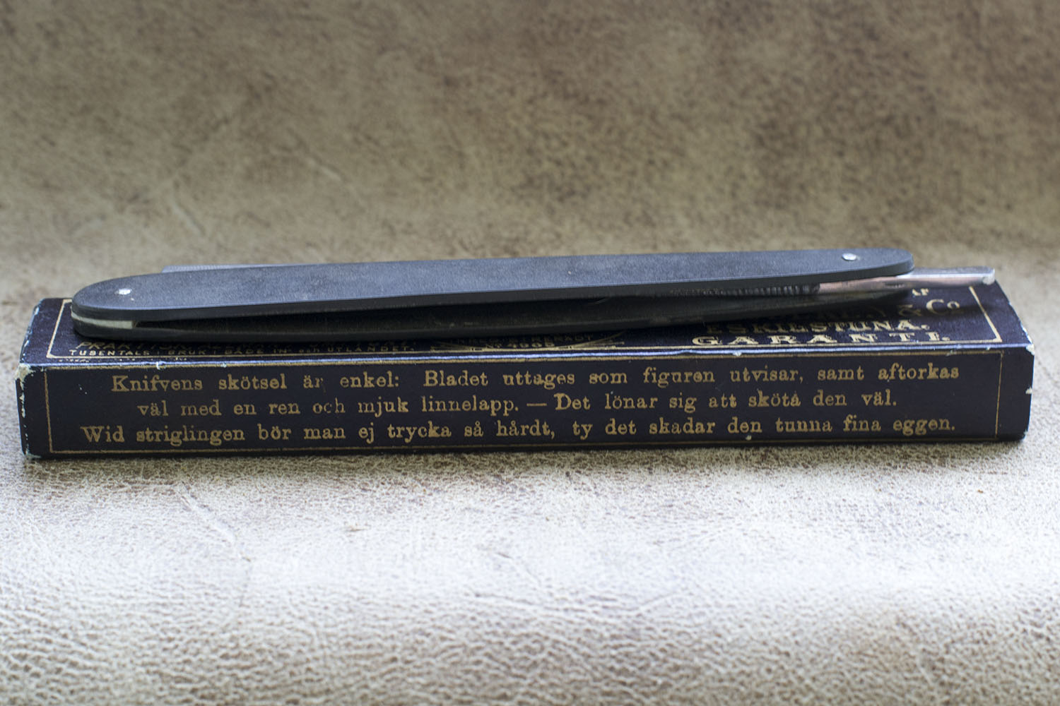 Опасная бритва типа фрембэк от известного шведского производителя. Предположительно второй половины 19 века. Надежная система фиксации лезвий, позволяет получить полноценную опасную бритву при этом иметь в запасе 2 острых наточенных лезвия. Бритва не имеет следов заточки на обушке из чего можно предположить что она не была в использовании - однако лезвия до сих пор очень острые, возможно были заточены на заводе. Ширина полотна 21.7 мм . почти 7/8, обушок 5.2 мм . В комплекте родная коробка в очень хорошем сохране и 2 лезвия. Сталь на подобных шведских фреймах всегда казалась мне твердой но тем не менее очень удачной. Цена: 8 750 Руб. Spoiler Show
