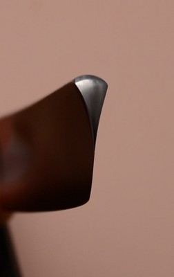 Ручка из целлулоида, в отличном состоянии, родная. Смело могу рекомендовать данную бритву для бритья, особенно для пользователя с опытом. Примерно 3 месяца назад купил себе точно такую же бритву и с тех пор ей брился бОльшую часть времени. Очень чисто выбривает за счет своей клинообразной геометрии и при этом весьма мягко и беззвучно работает. К сожалению, не удалось сделать адекватные фото. Создается впечатление, что РК с "обратной улыбкой", но это не так. РК слегка выпуклая - это лучше видно на последнем фото, где показана геометрия бритвы. Заточена и полностью готова к бритью. Ширина полотна 13 мм, толщина в обушке чуть меньше 4 мм. В комплекте штатный футляр.