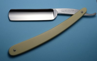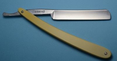 Ручка из целлулоида, имитация слоновой кости, в отличном состоянии, по-видимому, родная. Скорее всего, бритва весьма недолго была в пользовании, геометрия близка к заводской. Заточена и полностью готова к бритью. Ширина полотна 19.5 мм, толщина в обушке 5.5 мм.