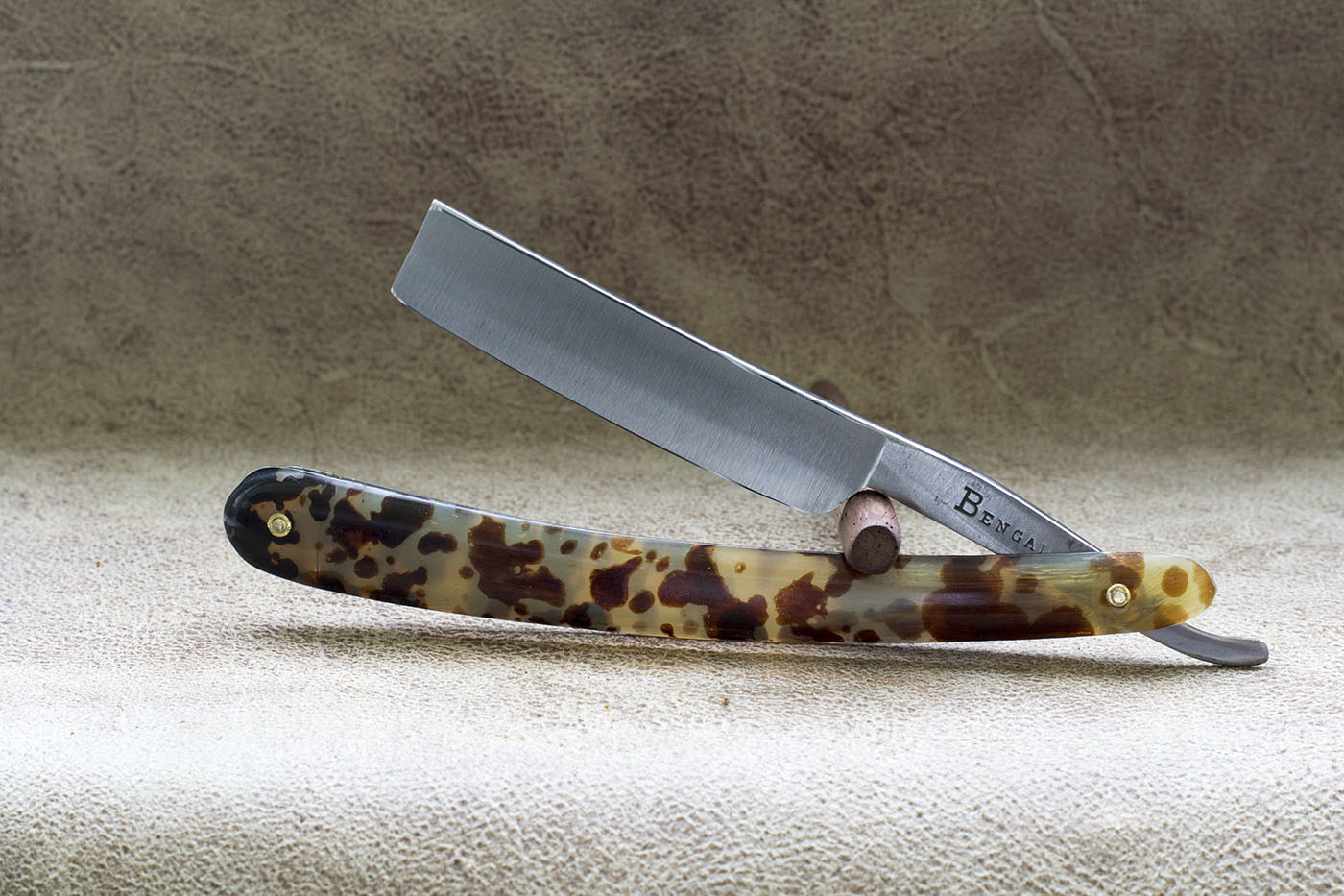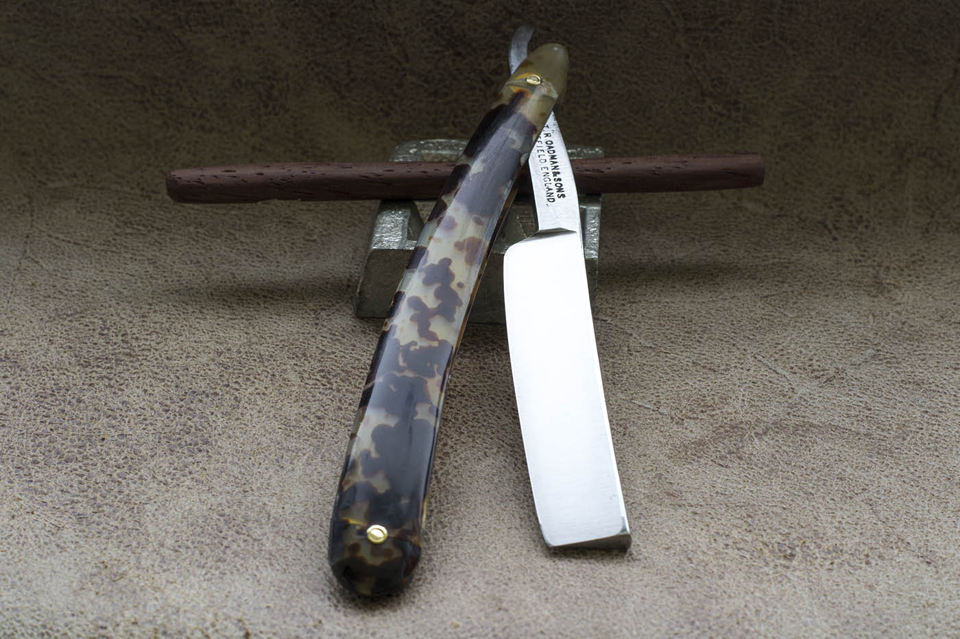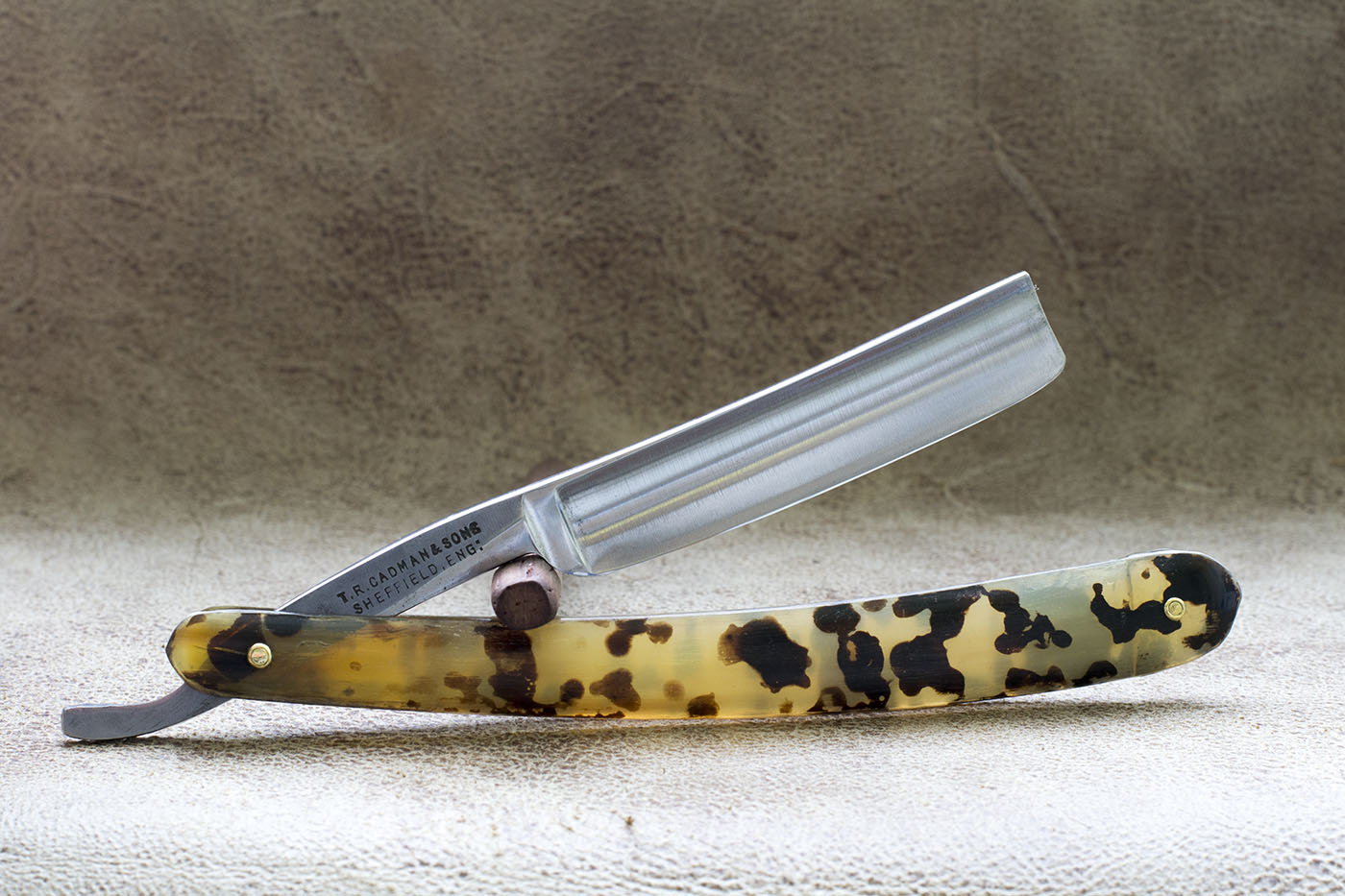 Английский Бенгалл времен Томаса Рэдли Кадмана. Рукоять из рога, протравленного под черепаху, родные латунные шайбы, ширина полотна 5/8 дюйма, клин. Период изготовления конец 19 - начало 20 века. На бритве были некоторые следы от камня на обухе и кромке, я считаю это заводской заточкой, кромка не была сведена и бриться с такой заточкой было невозможно. По сути это NOS бритва, по моим заключениям не находившаяся в использовании. Состояние полотна великолепное, заводской сатин,который намного грубее того что можно встретить на более современных бритвах, видна грубая риска от камня, полотно отполировано мной вручную. Бритва заточена и готова к бритью. Продано Spoiler Show