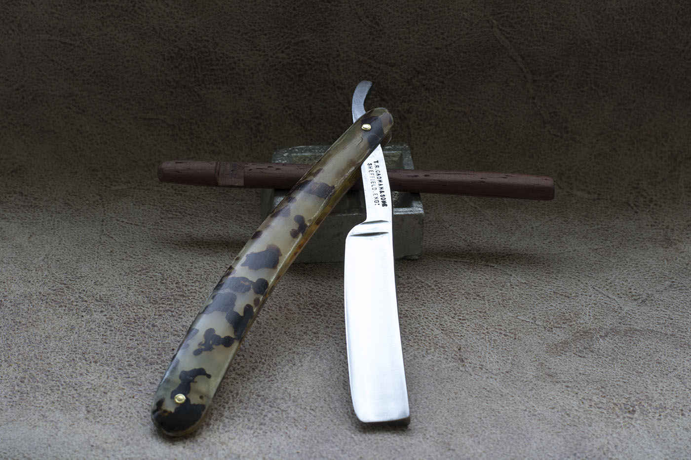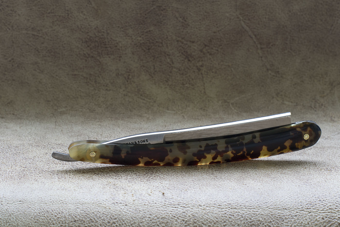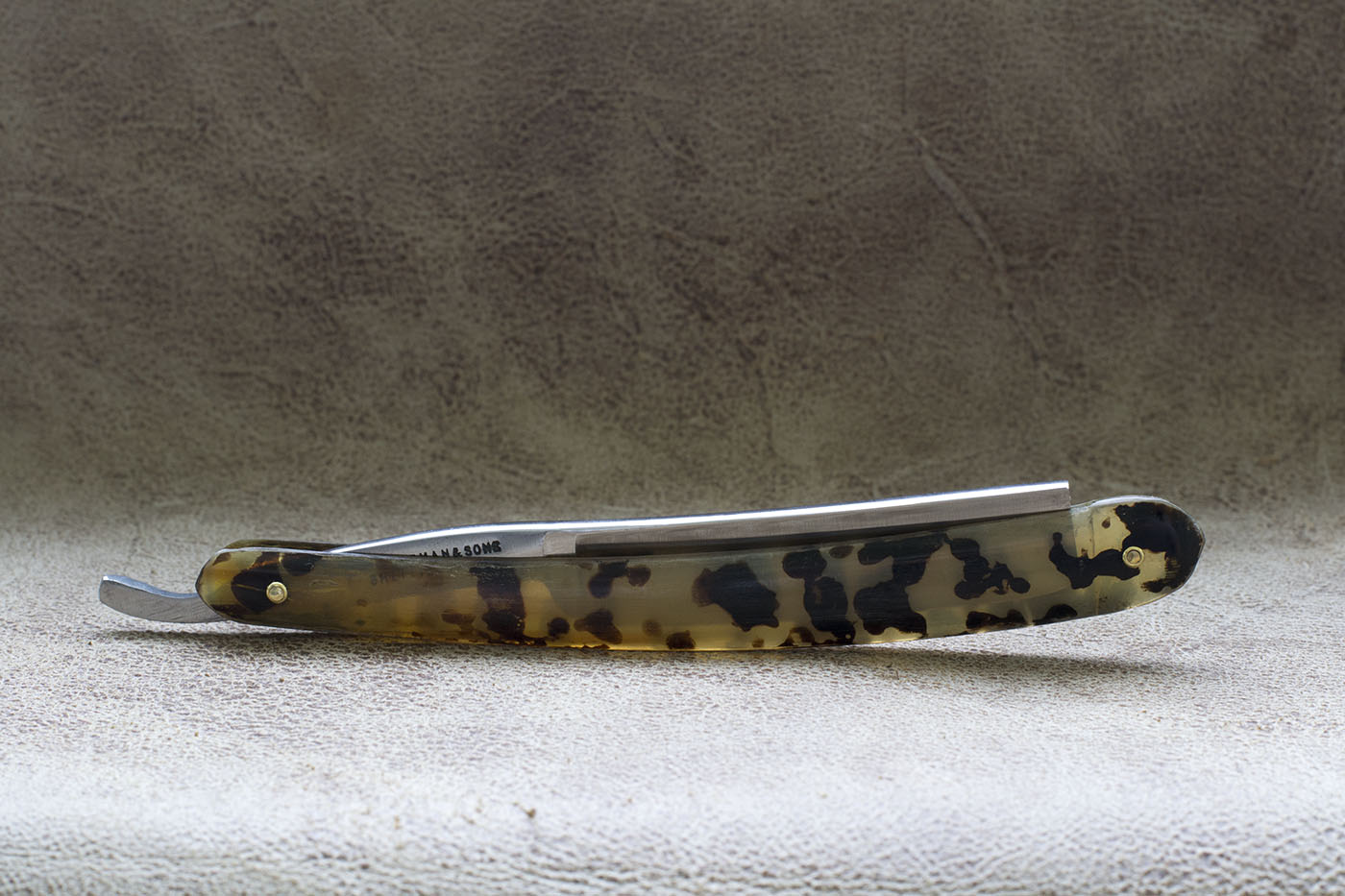 Английский Бенгалл времен Томаса Рэдли Кадмана. Рукоять из рога, протравленного под черепаху, родные латунные шайбы, ширина полотна 5/8 дюйма, клин. Период изготовления конец 19 - начало 20 века. На бритве были некоторые следы от камня на обухе и кромке, я считаю это заводской заточкой, кромка не была сведена и бриться с такой заточкой было невозможно. По сути это NOS бритва, по моим заключениям не находившаяся в использовании. Состояние полотна великолепное, заводской сатин,который намного грубее того что можно встретить на более современных бритвах, видна грубая риска от камня, полотно отполировано мной вручную. Бритва заточена и готова к бритью. Продано Spoiler Show