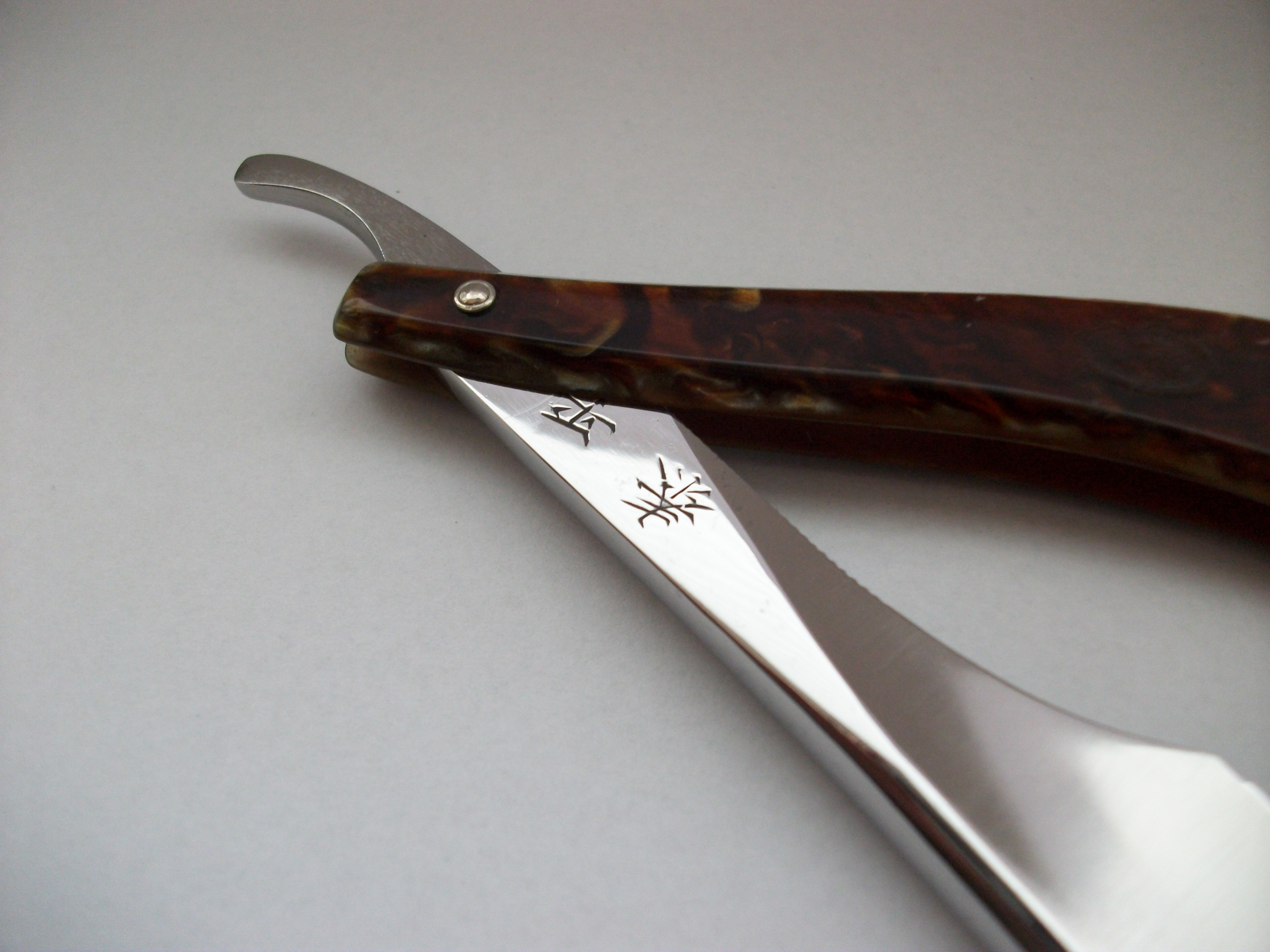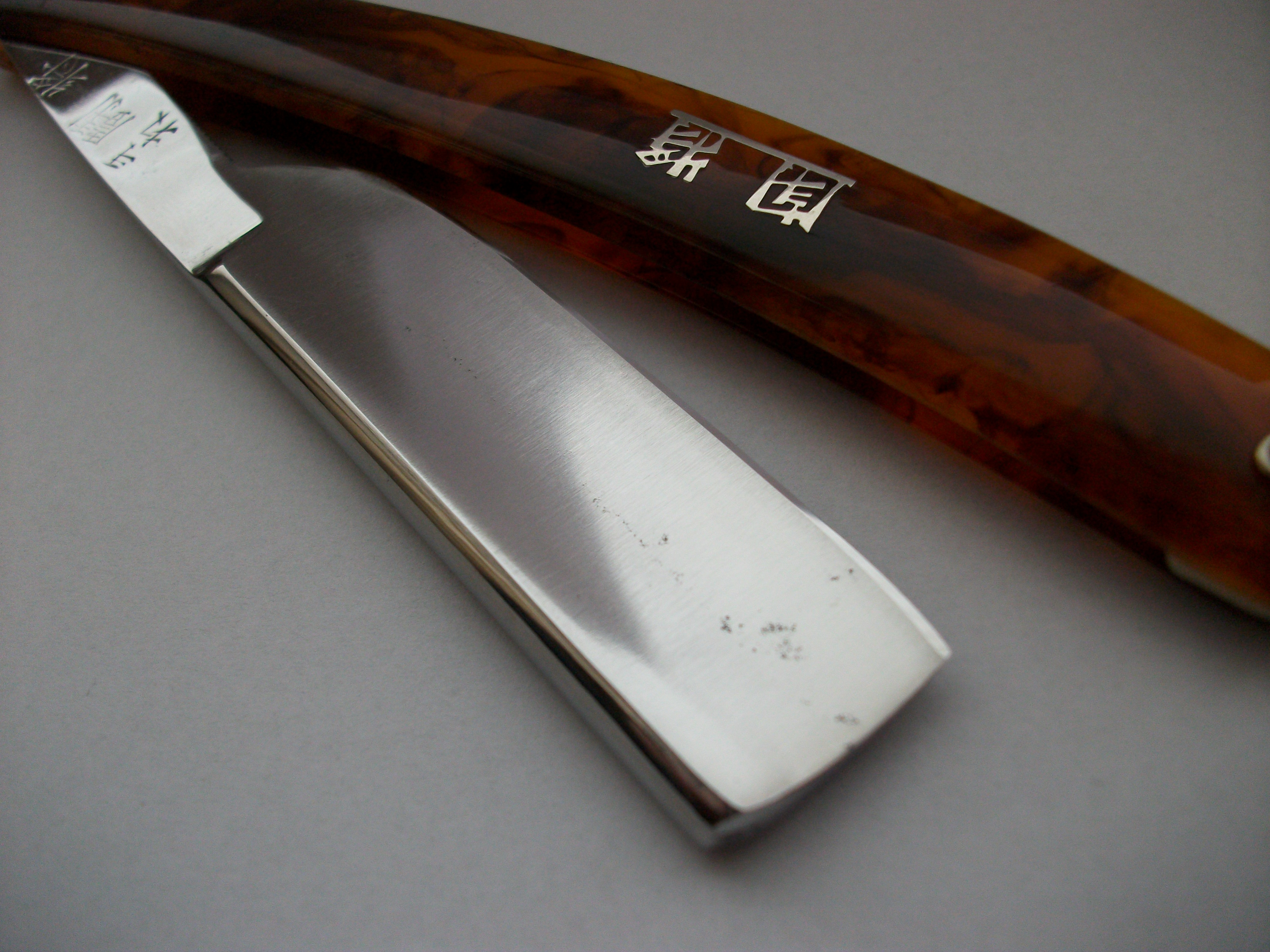 Данный японец достаточно популярен у коллекционеров. Углеродистая сталь, ширина полотна 21мм, длина режущей кромки 58мм, вогнутость 1/2, ручка пластик. На полотне остались следы времени, но родной сатин присутствует как и травление. Заточена и готова к бритью. Продано Spoiler Show