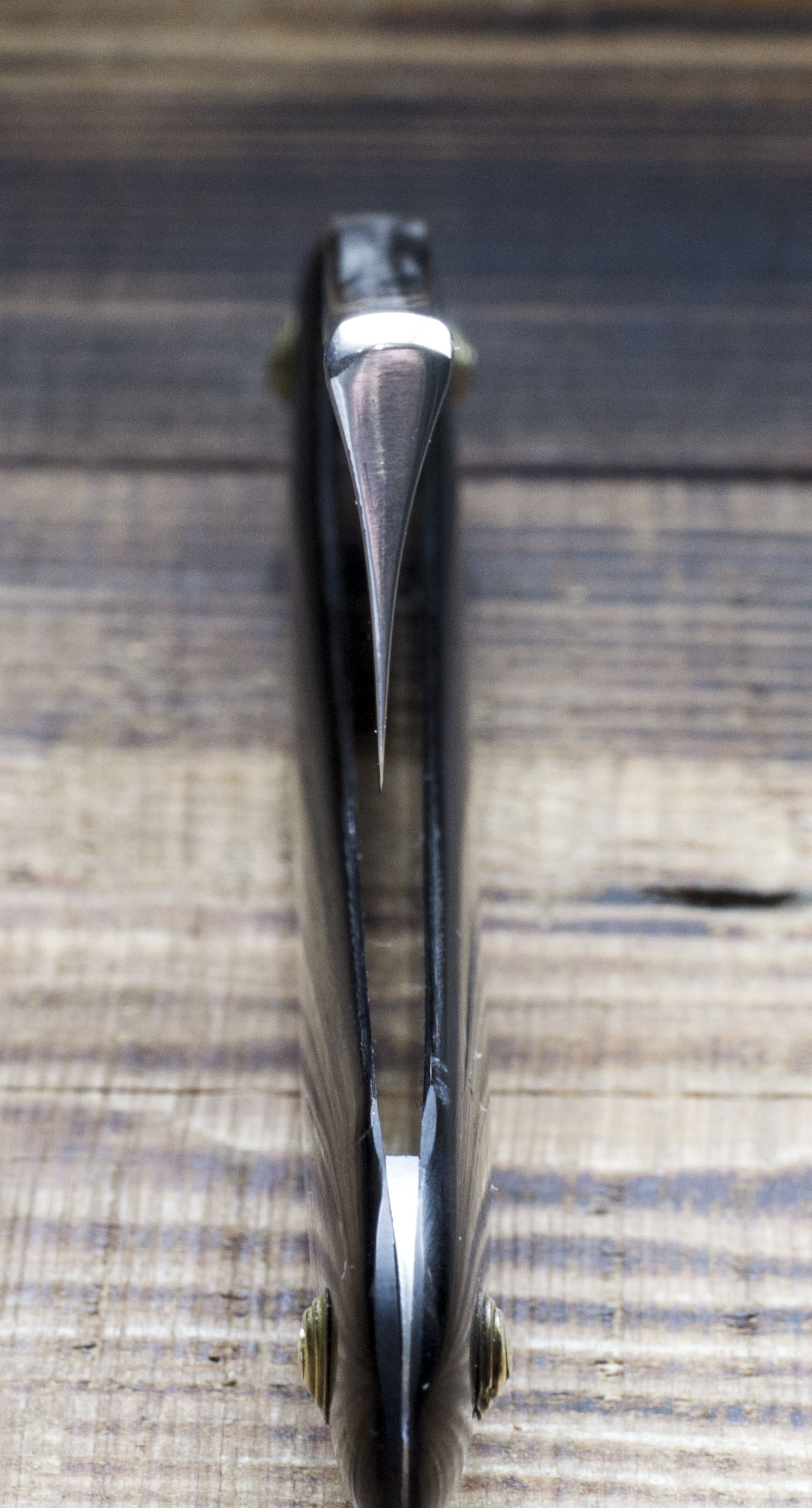 Продаётся от BorisCanon 75 G.M Бритва малоизвестного французского бренда, основанного в начале 20 века в городе Тьер, неким Guillemin Mallaret вероятно производство существовало и в более ранее время, просто в 1915 Малларе зарегистрировал еще несколько торговых марок, в том числе и Canon 75 G.M. Клинок сделан по классическим французским технологиям, форма так же традиционна для Тьера и Франции в целом, но эрль имеет удобную подпальцевую выемку, что является редкостью. Улыбчивая форма клинка с расширением от пяточки к носику обеспечивает очень комфортное, качественное бритье за счет имитации так называемого "косого реза". Для изготовления использована качественная литая углеродистая сталь, Magnetic Extra в данном случае является не более чем маркетинговым ходом того времени, магнитных свойст полотно не проявляет. Рукоять бритвы изготовлена из рога, вероятно буйвола, клинышек традиционно белый, но уже не из кости а какого то неизместного для меня материала. Бритва сохранилась практически в нетронутом, первозданном виде, обух не имеет следов заточки, можно предположить что бритвой не пользовались, так же на полотне есть травление - Magnetic Extra, с несколькими царапинами, но все еще читаемое. Ширина 20 мм (6/8+) Бритва заточена и готова к бритью, рекомендую новичкам, решившим освоить клин, так же интересна как экземпляр коллекции ввиду редкости. Продано Пушка Show