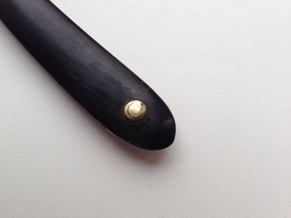 Ширина полотна 6/8 , оригинальные пины из латуни и ручка из рога . Заточена и готова к бритью .