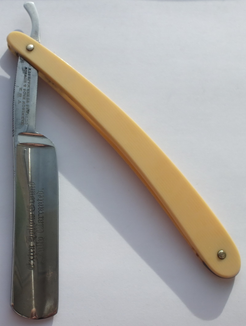 Оправа целлюлоид, клин олово, пины нейзильбер. Клинок 6/8 , вогнутость Extra Hollow Ground, размеры145х21х5,2 мм. Бритва заточена и готова к бритью. Бреет с шипением разъяренной гюрзы, очень мягко и чисто.