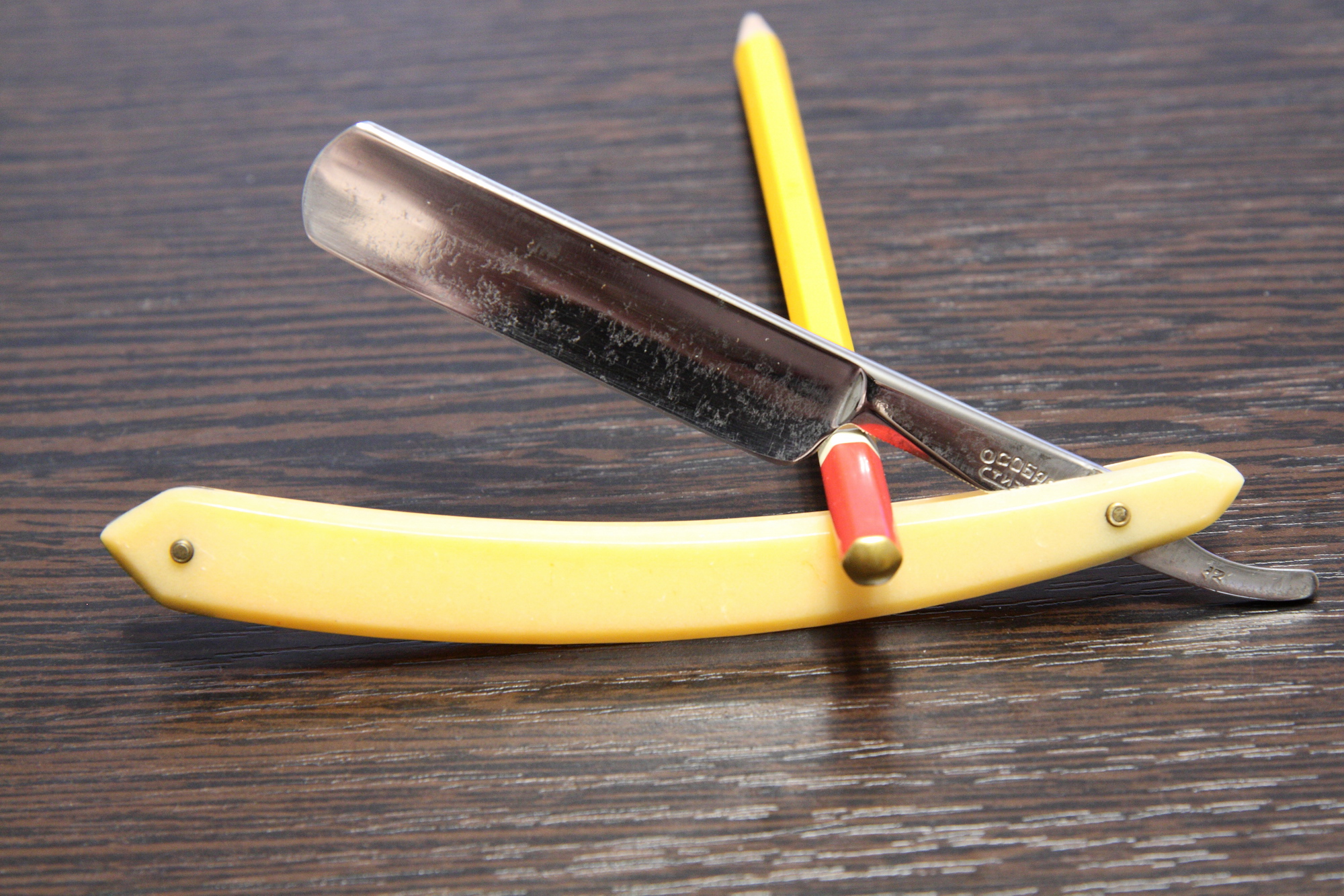 Опасная бритва завода Труд Вача, 1948 год. Ширина полотна 16 мм, все родное, футляр тоже (но очень плохо сохранился). Бритва пришла с пятнами коррозии, почистил полотно вручную (остались некоторые следы, но кромка чистая) и заточил, подготовлена мной к бритью. Отличный представитель старых советских бритв с шикарной сталью и профилем полуклин - уничтожителем густой жесткой щетины. Такие бритвы сейчас редкость. Цена - руб.