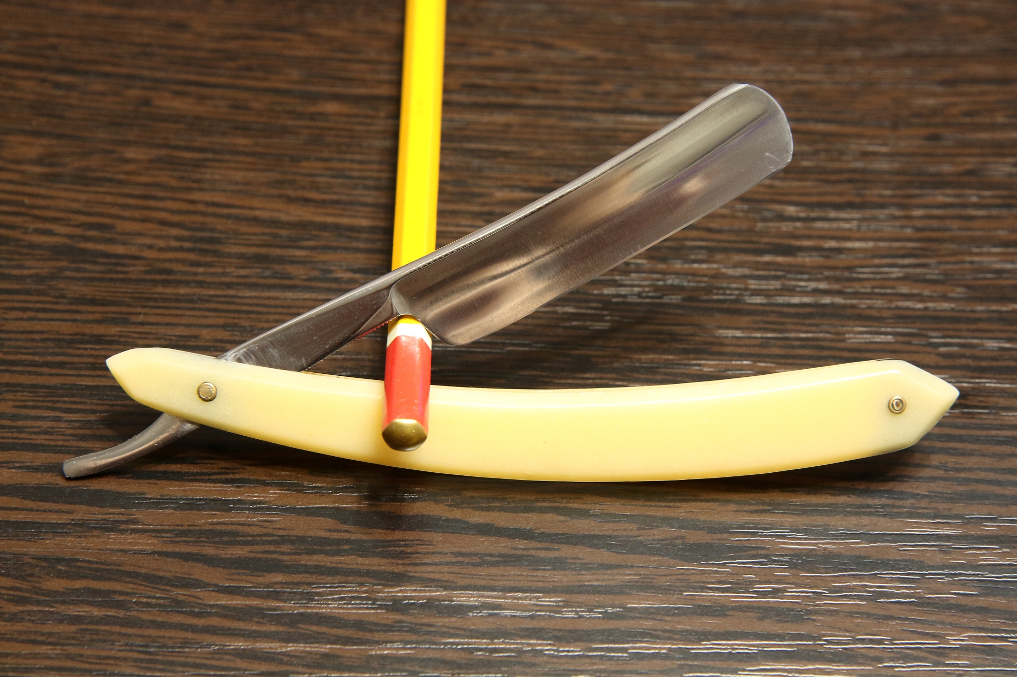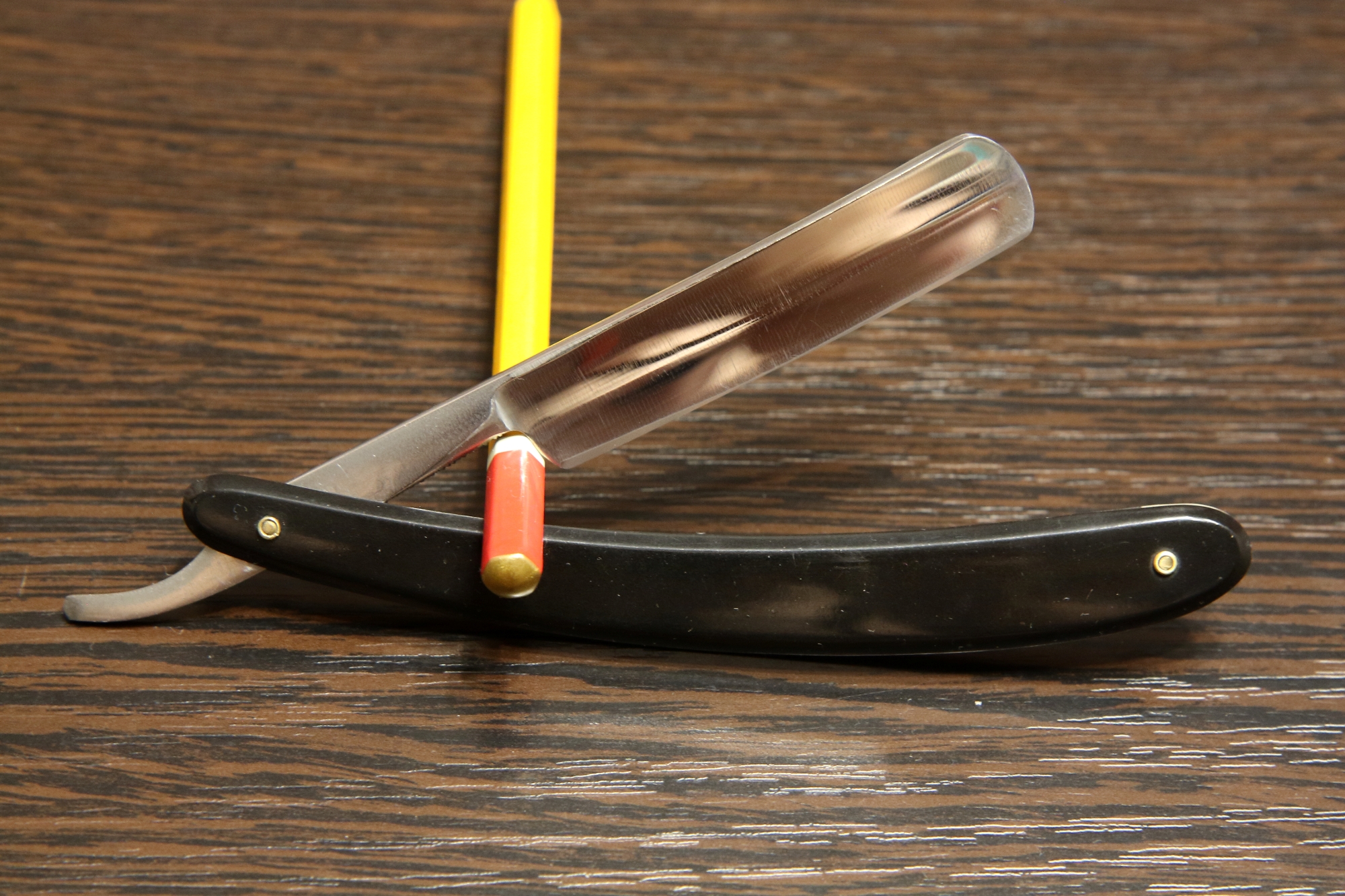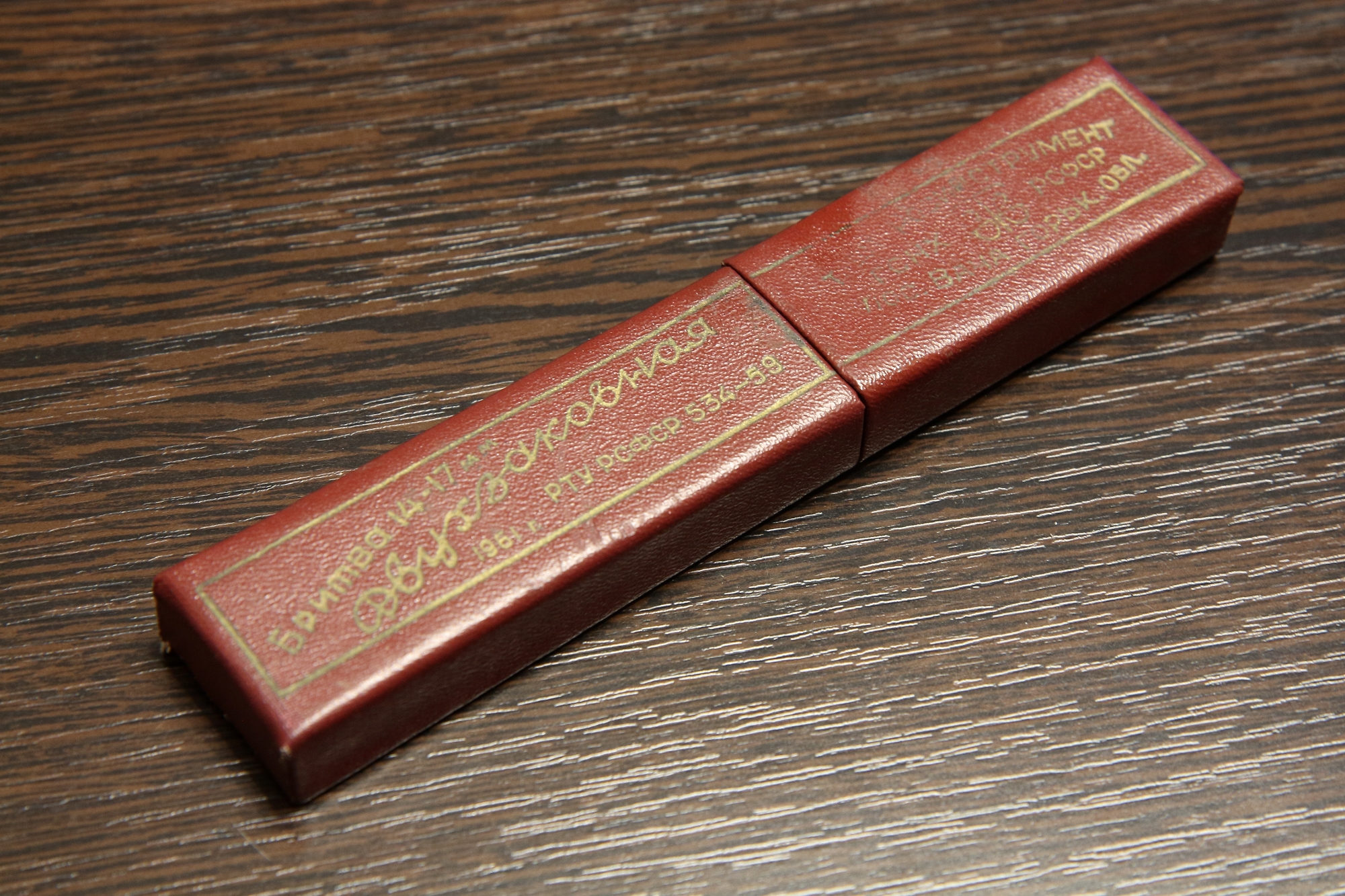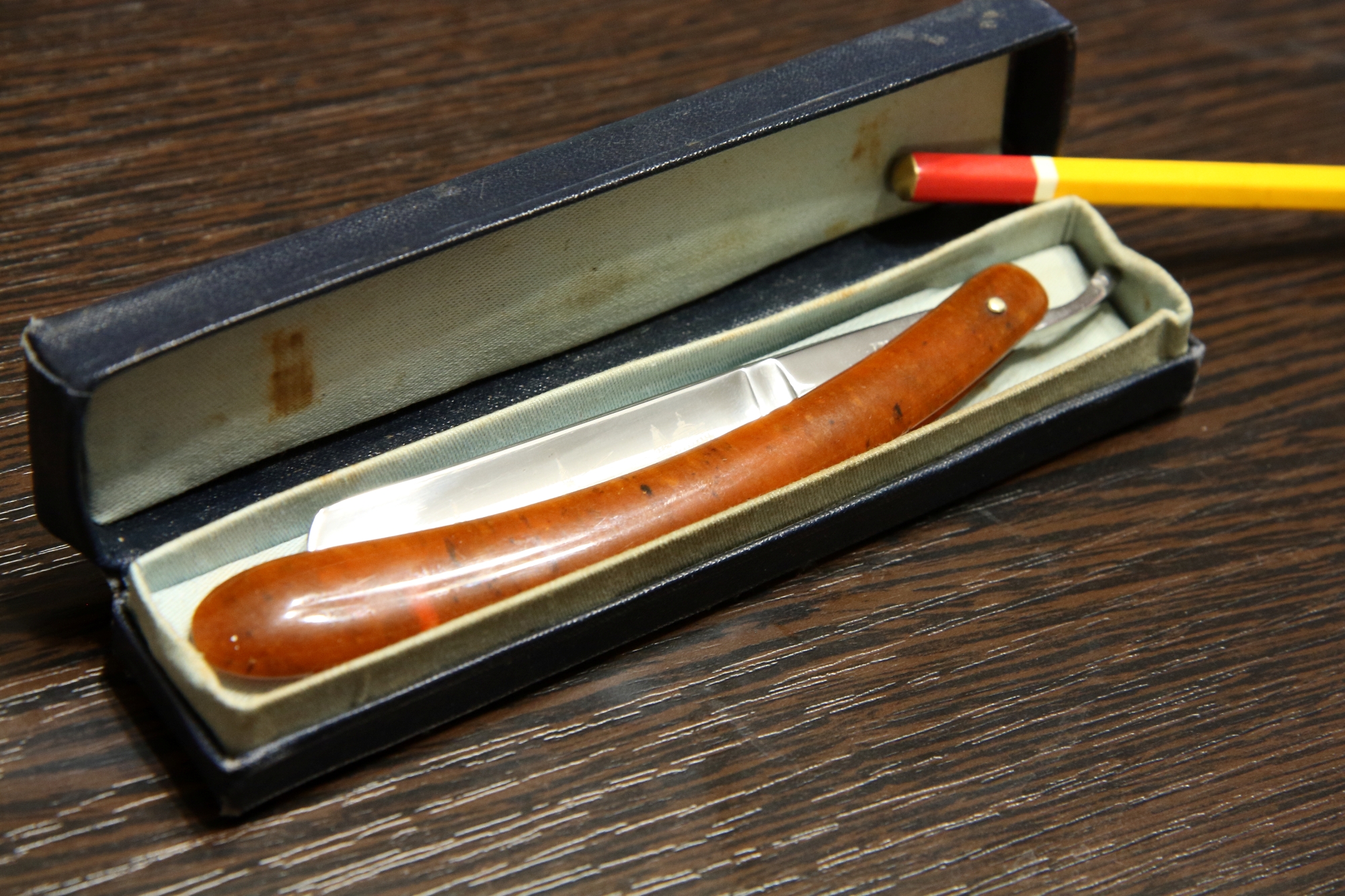 Опасная бритва Двухзаковная, завод ЗТВ (Вача), 1962 год. Ширина полотна 15.5 мм, двухзаковный клинок, все родное, футляр тоже. Пришла с заводской заточкой и без следов использования. Геометрия не совсем идеальна, но заточку я вывел полностью, в последующем затачиваться и правиться будет без проблем. Подготовлена мной к бритью. Сталь качественная (хотя и бреет несколько жестковато), верткий клинок. Двухзаковные от ЗТВ очень нечастые гости, особенно с ручкой такого интересного цвета. Цена - руб. К бритве рекомендую приобрести ремень для правки опасных бритв моего изготовления из итальянской кожи (подробнее на странице 4, объявления 56-58 и странице 9, объявления 127). Spoiler Show