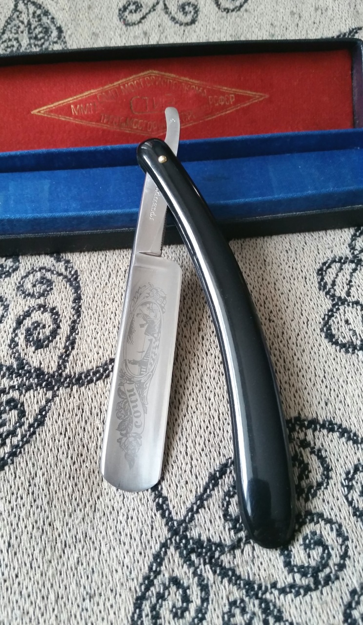 Опасная бритва Гравюра, завод ЗТВ (Вача), 1966 год. Ширина полотна 18.4 мм, все родное, футляр-сундучок подобрал по стилистике к ручке - сверху черный, а внутри красный и синий. Гравюра на полотне "Сочи". Пришла с заводской заточкой, и без следов использования. Чуть освежил полотно вручную полиролью с сохранением гравюры и заточил, подготовлена мной к бритью. Приятный экземпляр с передового завода Труд Вача, бреет не агрессивно и достаточно комфортно (при этом тихо), сталь средней твердости. Гравюра тут в идеале и отлично детализирована, на 1 фото просто игра света. Последнее фото это из моего обзора на нее, могу скинуть ссылку заинтересованным. Цена - руб. К бритве рекомендую приобрести ремень для правки опасных бритв моего изготовления из итальянской кожи (подробнее на странице 4, объявления 56-58 и странице 9, объявления 127). Spoiler Show