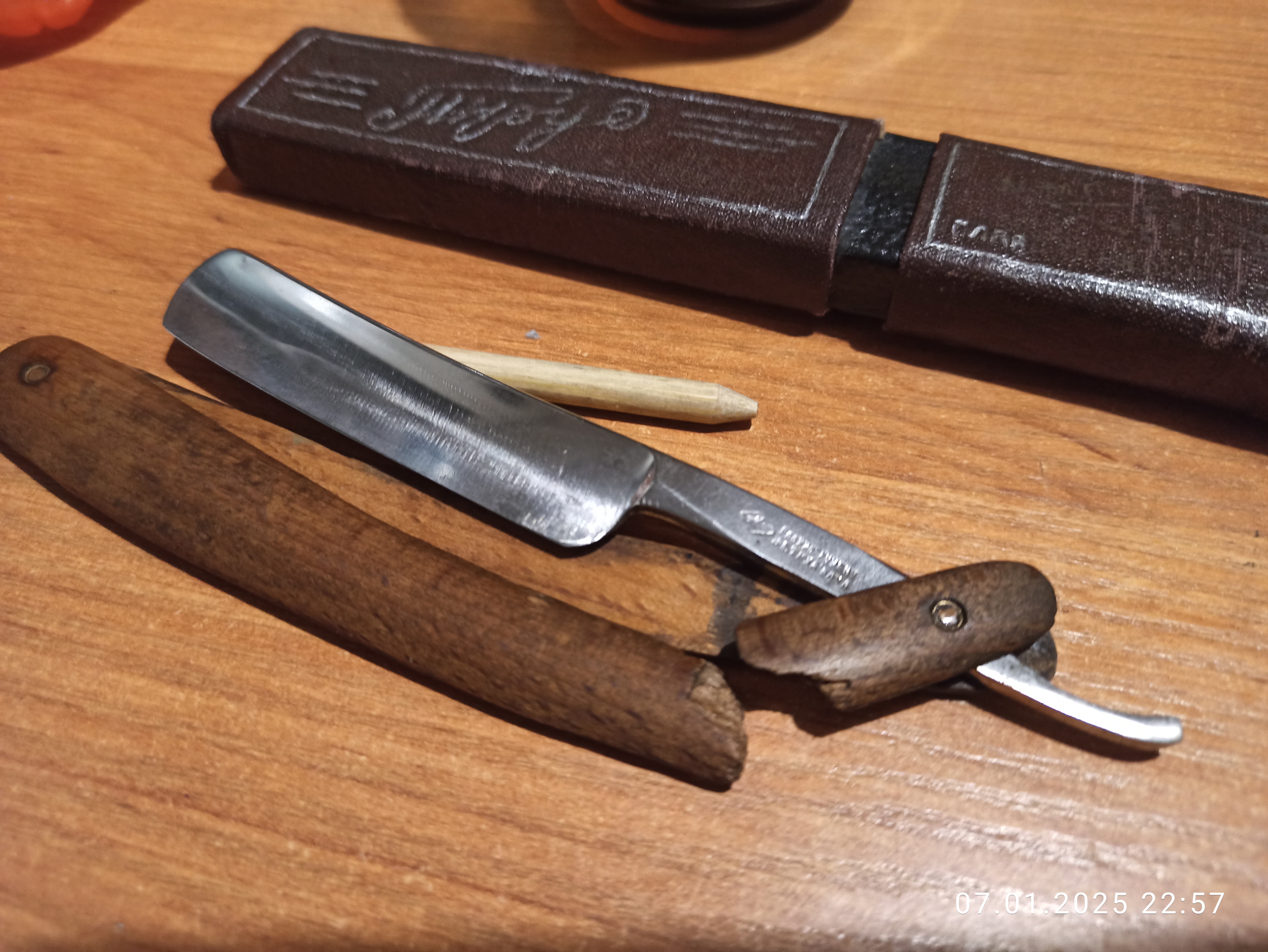 И именно по причине сломанной оправы. Пролежала в шкафу 80+ лет в пушечном сале. По обушку видно что точилась раз или два. Вот и. 32 года активно мусолю харю клинковой бритвой