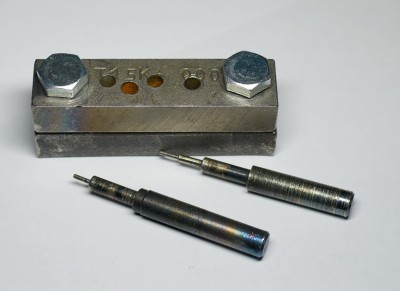 Раз пошел такой обмен, поделюсь своим пятачком, может сгодится кому.. Итак, когда надоело крутить квадратики на дремеле, пришло решение сделать что-нибудь более эффективное. Нашлись два старых резца, какой-то стальной пруток и доступ к станку. Что получилось - на фото ниже. Штампики-просечки дополнительно были до вишневого цвета нагреты резаком и закалены в масле. Получается этой штуковиной вырубать шайбы диаметром 3мм и 5мм, с внутренним отверстием 2мм. из латуни и нейзильбера толщиной до 1 мм. На латунную проволоку диаметром 1.8мм, которая у меня есть, просто замечательно подходит. Самое трудное - приноровиться стучать молотком с нужной силой. -)) В процессе работы выявились некоторые недостатки, так что на обдумываю "вариант два", переработанный и дополненный, хотя и первый вполне себе работоспособен. Вот, как-то так.