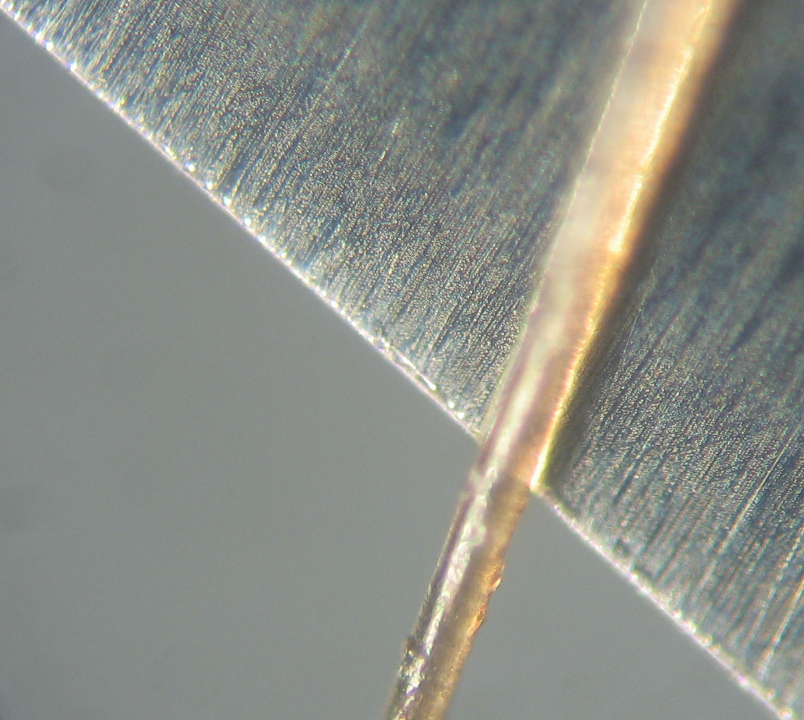 ну-кась я поучавствую со своим корявым приспособлением! В съёмках принимали участие: - собссно я - бритва СТИЗ СПОРТ 53г нашего будущего форумчанина, - волос с головы менеджера интернет-магазина, - фотик Casio Exilim EX1200 в макрорежиме, - лупа х20 и лупа х5. Всё энто хозяйство расположил в виде сэндвича и снимал. О результатах судите сами! Для масштаба скажу - толщина волоса на снимке около 0,04мм. Измерял электронным штангенциркулем. Как вам мой сендвичскоп? З.Ы. Вообще-то можно было ещё подрастянуть снимки чтобы добится большей видимости увеличения, но жаль резкость портить. Ремонт опасных бритв, звонить с 11-00 до 23-00, +79267729357, (whats app, telegram, VK), спросить Олега.