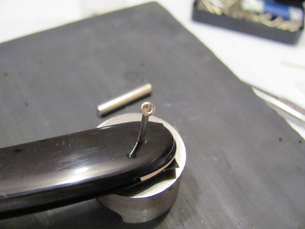 1. Заклеить изолентой РК, что бы не пораниться и случайно её не повредить. 2. Делаем 1 удар керном по центру пина, рекомендую пин немного сделать плоским, для удобства. 3. Сверлом 1.6 мм делаем отверстие глубиной 2 мм, потом сверлом 1.8 мм. Тут размер сверла зависит от толщины пина ( оси). 4. Высверлив пин, аккуратно снимаем верхнюю часть ручки, потом сняв фаску на пине , вынимаем вторую половинку ручки. Сборка ручки. 1. Заклеиваем изолентой место посадки пина ( т.к. ручка теперь отполирована, портить её не хотелось бы). 2. Одеваем шайбочку на пин (ось, гвоздик), аккуратно простукиваем трубочкой до упора в ручку. 3. Откусываем кусачками лишнее и зачищаем надфилем, зачищаем наждачной бумагой и полируем.