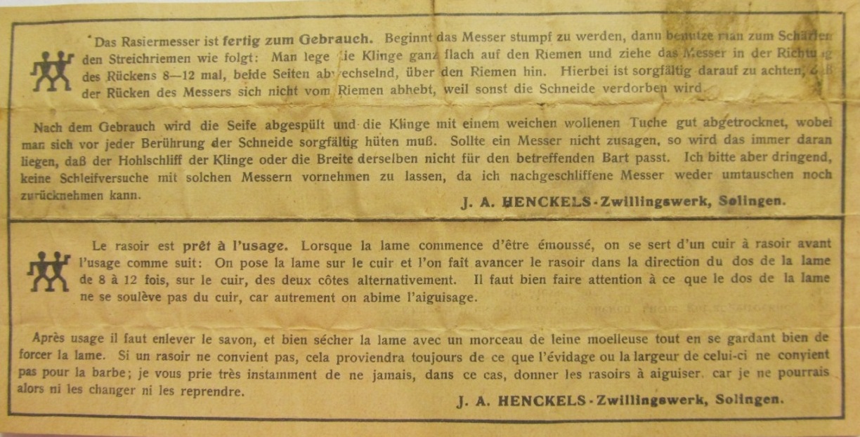 Фирма Henckels предоставила информацию, что в 1914 году у неё было 135 разных артикулов бритв. Только различные вариации ширины бритв, гравировки и материалов ручек могут быть источником столь широкого ассортимента бритв.