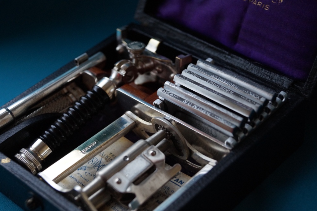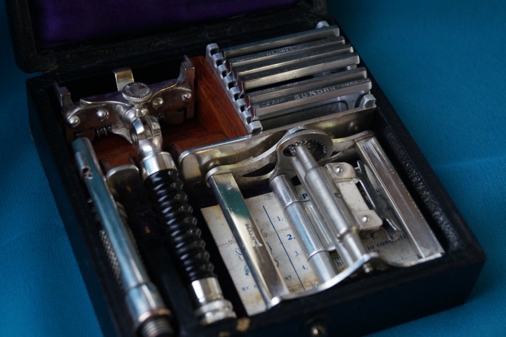 Г-образный станок Wilkinson Sword Co.Wilkinson Sword Co. Made in England. Alfred Dunhill Ltd London & Paris Описание: недельный набор для бритья, Г-образный станок со сменными лезвиями, подписанные днями недели. В наборе есть приспособление для заточки лезвий и конструкция для правки. Родной ремень был потерян во мраке времен, был изготовлен новый, проверил лично-работает. Вывод: прекрасный предмет старины и свидетельство того, как осуществлялся переход от клинковой бритвы к Т-образному станку. Переход был сложный, поиск инженерной мысли был высок и интересен. Качество стали на клинках просто великолепное, звенит как музыкальный камертон. Конструкция станка регулируемая как по наклону так и по вылету лезвия. Конструкция станка предусматривает вращающуюся витую ось, кстати очень удобная при бритье и она же выступает в роли регулировки вылета. ПС Данный набор был отреставрирован для уважаемого человека, за что ему спасибо, что дал возможность и оказал мне доверие с работой над его набором. По взаимному согласованию, мною был произведен тест на предмет бритья, результат бритья был весьма неожиданным, бреет великолепно ( мне очень понравилось), прямо как на машине времени слетал в то время, где господа позволяли себе купить довольно дорогую вещь и бриться ею, простым людям врядли был доступен такой набор. Надеюсь данный станочек займет достойное место в коллекции и в истории нашего форума.