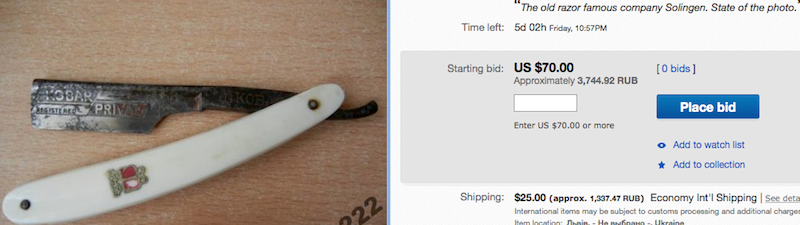 Re: Аукционы: плагиат, развод и "великолепные" описанияА чего тут такого? Мужик честно написал, что сделал бритву сам, и что она острая. И полно любителей такой экзотики, чтобы ее купить.