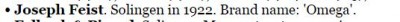 Re: Joseph FeistКомпания Joseph Feist была в бизнесе 1898-1924. Расположена в № 18 Dolnerstrasse, Золингене. Торговые марки: Blenda, Glücks-Messer, LA SEMEUSE, MPN, OMEGA, SOSIMA, VIOLET, WANDERHEIL. Производила ножи (перочинные "карманные"), бритвы, столовые приборы, ножницы. http://www.archivingindustry.com/cutler ... makers.htm Так что - выпуск около 1922 года. Вещь! Фабрика Йозефа Файста — «OMEGA» — была основана в 1864 году, в 1888 году носила название «Joseph Feist Nachf. Omega — Werk» (наследники Йозефа Файста). Фирма выпускала широкий ассортимент товаров, имела торговые связи с Польшей и Россией. Поскольку семья Файст имела еврейские корни, в 1941 году фабрика была национализирована нацистским правительством, а ее члены эмигрировали в Лиссабон, где проживают до сих пор. С 1941 года фабрика носила название «Omega-Werk Hartmann&Co», c 1997 года – «Omega Herbert Kleber», в 2003 году она еще раз сменила владельца. До последнего времени производила дешевые кухонные ножи, экспортировавшиеся в Турцию. В 2013 году фабрика прекратила свое существование. 21 октября 2013 года оба ветхих здания фабрики постройки 1900 года были снесены. http://muzei-nozhnic.ru/nozhnicy-dlya-v ... vejcariya/