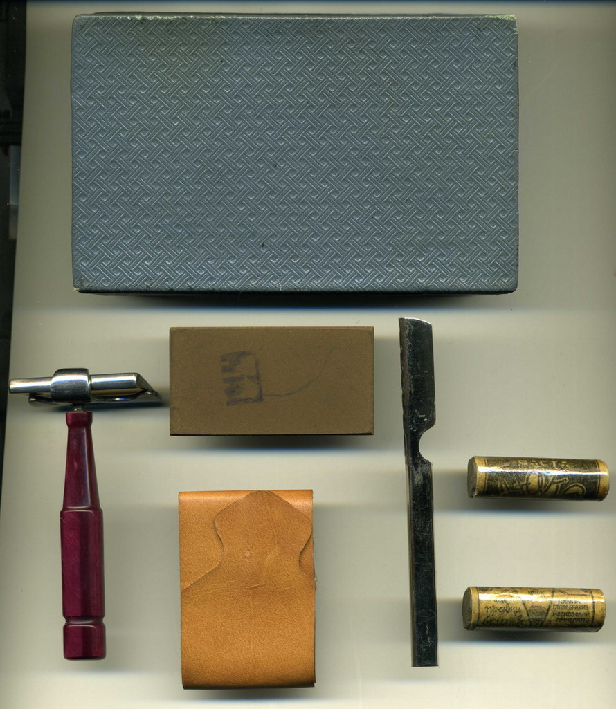 - футляр обтянутый серым ледерином, внутри выстлан синим бархатом. С ячейками под все вышеуказаные аксессуары.