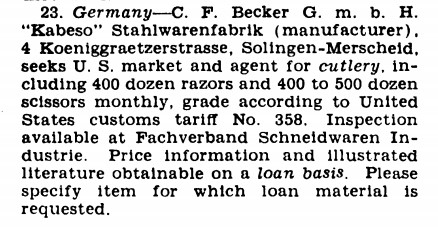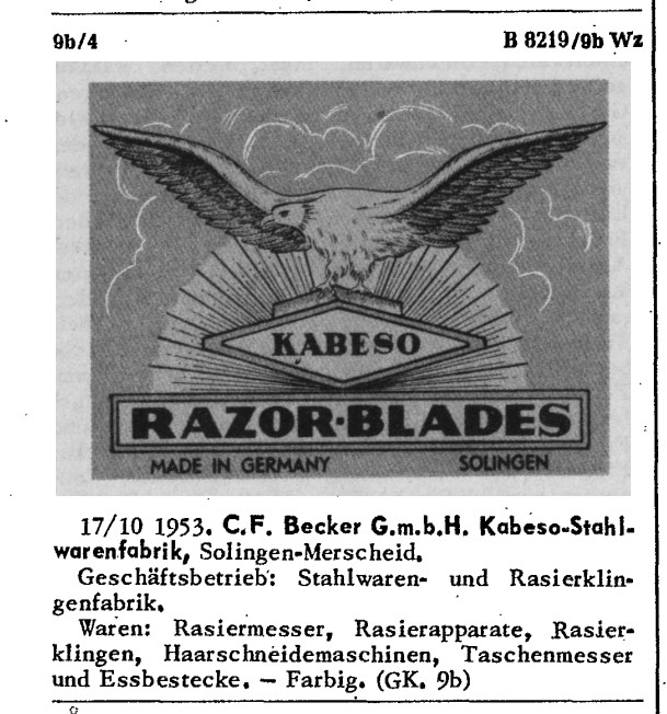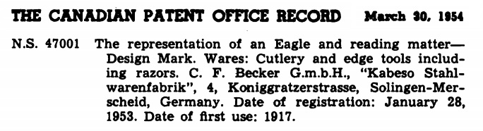 канадский патентный журнал 1954 год. торговая марка Орел и reading matter (не знаю как перевести, "открытая книга", что ли) зарегистрирована в 1953 году, используется с 1917 года. (картинки выше по теме) Реклама из коммерческого журнала, США, 1952 год: C.F. Becker GmbH ищет рынки и агентов по продажам столовых приборов, включая бритвы, объемом 400 дюжин в месяц и ножницы, объемом до 500 дюжин в месяц. (для примера фирма DORKO, в этом же году, предлагала объемы в 1000 дюжин бритв, 2500 дюжин ножниц, 3000 дюжин маникюрных инструментов). (вообще говоря, не дюжин, десятков) по итогу, временные рамки вырисовываются 1917 - 1954+ Из немецкого патентного журнала 1954 год: