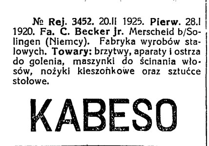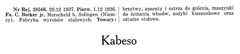 Все говорят, но немногие знают, в каком. Re: Kabeso, Solingen.Из польского патентного журнала, 1925 и 1937 годы. фабрикант C. Becker jr. Spoiler Show Kabeso, Solingen.Еще пара капель: