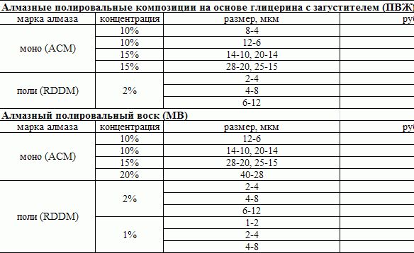 Теперь конкретно по параметрам. Насчёт брусков из того что нашёл в местных прайсах, отечественного производства есть вот это: Брусок абр. 64С БП 40-20-200 М50 СМ в ГОСТе к сожалению не указан размер зерна, но указан Параметр шероховатости обработанной поверхности Ra, мкм, не более 0,80. Вроде бы умные люди тут писали что зелёный карбид кремния да ещё на керамической связке это есть хорошо. Хотелось бы услышать мнение конкретно по данному образцу бруска. По поводу паст у нас есть как алмазные так и ГОИ (тоесть не совсем ГОИ, а сделанные по ТУ). То что у нас называется ГОИ доступна 4 разных классов, карточка выглядит примерно вот так: ГОСТ 2912-79 ТУ 6-18-36-85 Есть ещё куча разных алмазных паст, честно говоря времени разбираться с их характеристиками просто не было: Как вариант изготовитель предлагает просто порошок без основы, а так же полировальные смеси алмазного порошка на различных основах: что посоветуют знающие Люди? Также хотелось бы уточнить технику использования этих паст: как и на что мазать, в какой последовательности с другими абразивными материалами использовать и можно ли обойтись только пастами, вообще исключив камни? Спасибо.