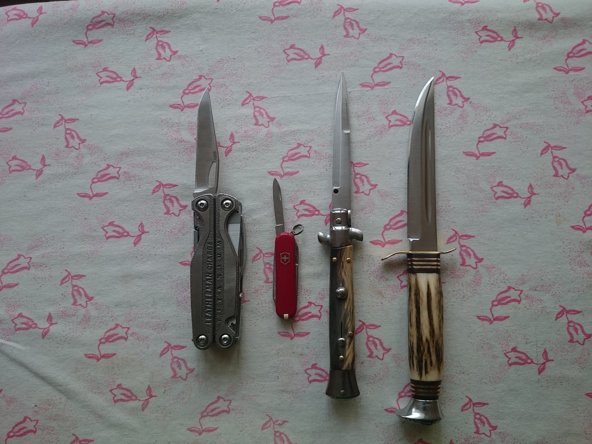 1) Мультик Leatherman Charge TTi 2) Victorinox SD (принадлежит супруге) 3) F.Beltrame 4" 4) Старый золингенский нож, дедов Самый маленький используется чаще остальных.
