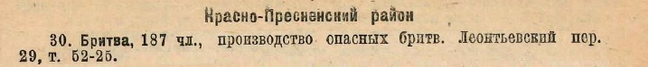 артели Бритва - 1930, изначально производство располагалось в Леонтьевском переулке, дом 29, а затем они переехали на ул. Шаболовка, дом 40.
