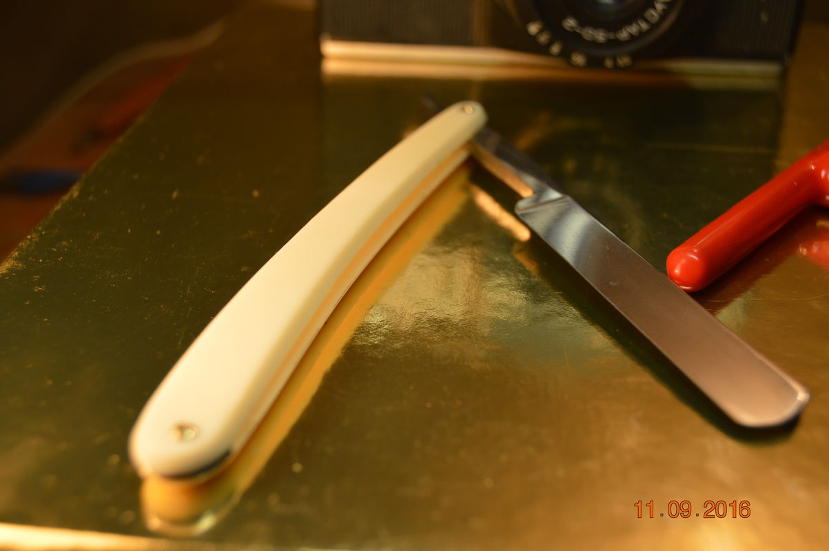Re: Продаётся от artemarut1Spoiler Show Добрый день. Бритву BENGALL получил, к упаковке претензий нет. Вытер от масла, протёр спиртом и обнаружил на внутренних сторонах половинок ручки выпуклые номерные цифры, как при литье. В объявлении указано - ручка РОГ. Вопрос: возможно ли такое на роге или это всё-таки эбонит? Продавец посоветовал потереть ручку наждачкой( будет коричневый налёт) и понюхать( должен быть специфический запах рога). Всё сделал. Потом тоже самое проделал с эбонитовой ручкой от другой бритвы, разницы не заметил, такой же коричневый налёт и очень похожий запах. Кстати, на эбонитовой стоят такие же цифры. Бритву покупал для себя ещё и из-за роговой рукоятки. Уважаемые форумчане, понимаю здесь не место для обсуждений, но жду ваших мнений и помощи.