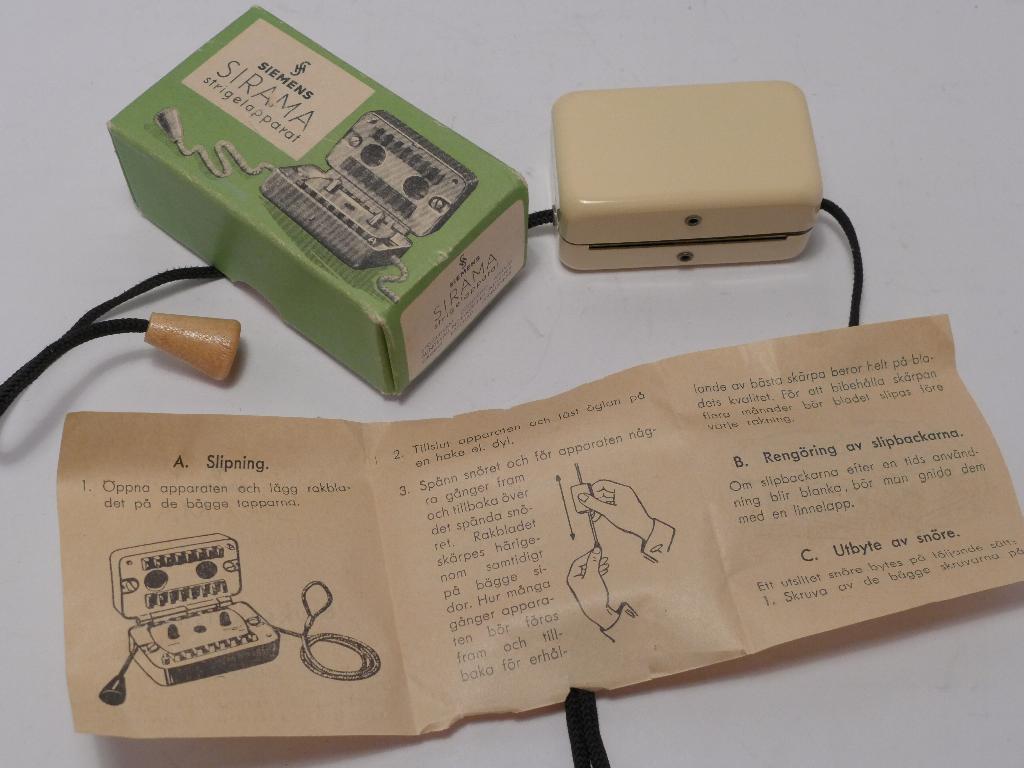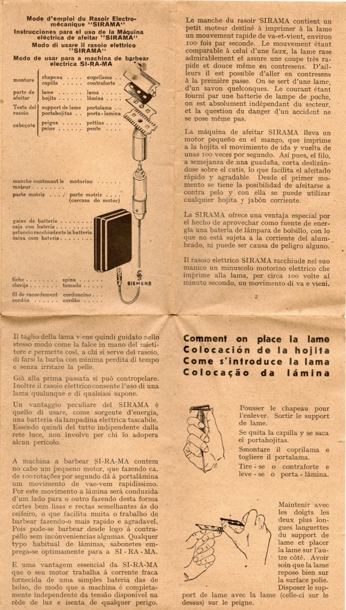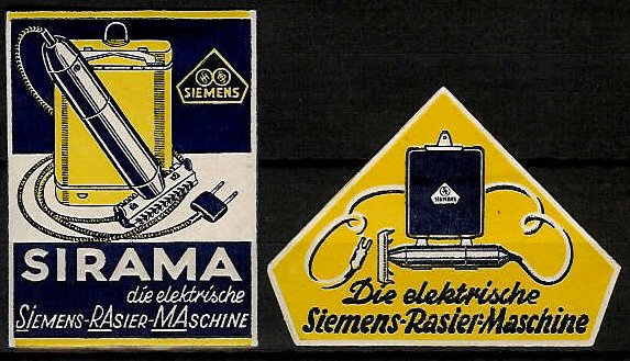 Называется Siemens Sirama, от немецкого Siemens Raiser Machine. Выпускались с 1932 по 1939 год. В 1933, кстати, в Лондоне был запатентован сам принцип работы - в отличии от всех остальных электробритв довоенного времени, у Sirama не просто вибромоторчик, от которого бритву трясет, а подвижное лезвие. На валу двигателя стоит треугольный шпиндель, а лезвие фиксируется в головке подпружиненой планкой. Моторчик крутится, треугольник вращается и двигает лезвие, пружинка возвращает его на исходную. Питается моторчик от прямоугольной батарейки 4,5в, такой, как в старых фонариках железнодорожников. Плюс в наборе давался кронштейн на который можно вешать бритву и коробочку для батарейки. Насколько я понял, было несколько вариантов бритвы, ранний, у которого корпус батарейки бакелитовый, и второй, поздний, с металлическим корпусом. Что интересно - коробки для батареек не взаимозаменяемые: на бакелитовых стоит хитрый жестяной штекер, а на металлических обычного вида штекер-вилка. Вообще, информации о этой бритве очень мало, но по фотографиям я заметил, что было еще куча отличий - разные цвета бакелитовых коробок (черный или коричневый), разная кабельная оплетка (черно-белая, как с утюга, или просто коричневая) и разные варианты оформления коробки. Бритву продавали по всей Европе, потому-то и коробки разные. В довесок к бритве делали еще и машинку-точилку для лезвий с таким же названием. Правда, в комплект с бритвой она не шла. От обычной черной немецкой точилки, с которой потом слизали и советские, сименсовская отличается корпусом (есть две заклепочки) и цветом металлических потрохов - они не белые, а желтые. Я подозреваю, что это желтый цинк, вряд ли прям латуни кусок. Сами корпуса были разноцветные, и желтые, и красные, и голубые, и с наклейками и с объемным логотипом. Ксати, попадаются сименсовские точилки с белыми потрохами, но это колхоз - на них виден логотип в виде трех колечек, которого на сименсовской начинке нет. Олег Бритва, похвастайтесь, что у вас за бритва? Re: SiemensСпешу сообщить суперновость!