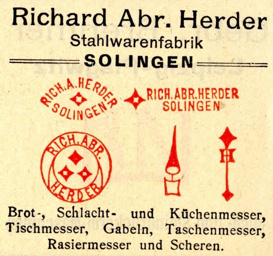 Richard Abraham Herder, другая ветвь великого семейства Herder, которая организовала производство столовых приборов и инструментов. Свой бизнес они начали в 1884, зарегистрировались 19 ноября 1884, Solingen, Rathausstrasse 20-22. С 1885 - R. Herder С 1916 - Richard Abr Herder С 1936 - Richard Abr Herder AG. Код-М7/18 Производитель — Richard Abr. Herder, Solingen M7h/ 18 Gebr. Knoth, Solingen Re: RICH ABR HERDER. SOLINGENв копилку логотипы: