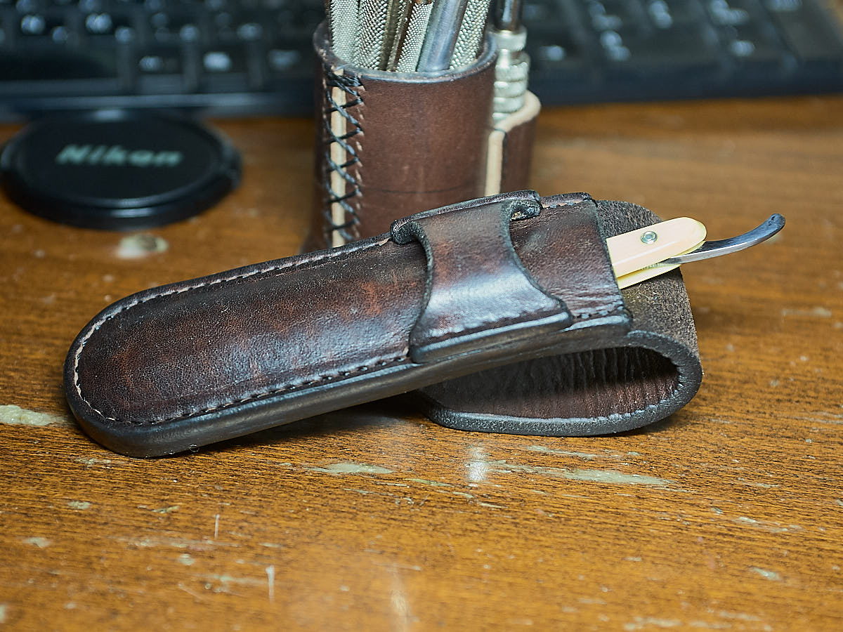 Кожа неизвестного донора, наверное техническая какая-нибудь, т.к. на производстве поделились. На ремни не годна, проверял, если только на ручку и верхнюю обвязку. А вот чехол получился, по-моему, ничего себе. Жесткий, очень надежно фиксирующий, но с разумным натягом отпускающий бритву. Недочеты некоторые вижу, но это первый экземпляр, пробный.