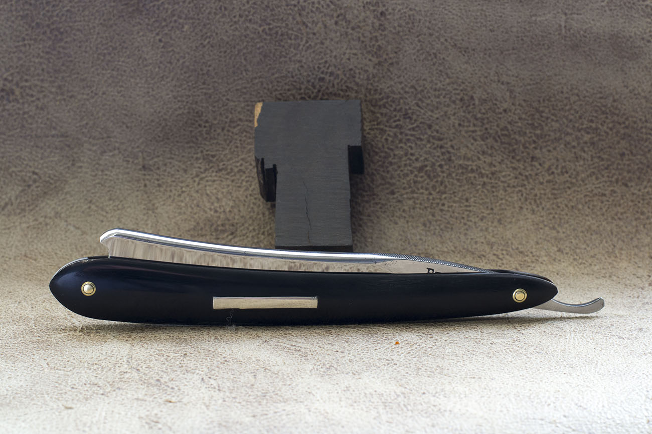 Миниатюрный, узкий полуклин от одного из известнейших производителей в Англии – Joseph Rodgers & Sons. Надпись на эрле свидетельствует о том, что Джозеф Роджерс являлся поставщиком Их Величеств Королей и Королев Англии. Хоть это и является лишь косвенным доказательством качества продукции данного производителя, но на деле все именно так – бритвы от Роджерса – прекрасны, сделаны из качественной углеродки, с завода имеют отличную геометрию, бреют чисто и мягко. Данная бритва получила новую рукоять из кости буйвола, имеет ширину в 5/8, вогнутость 1/2 , геометрия близка к заводской, фаска в районе режущей кромки тонкая и равномерная. Бритва прекрасно подойдет для окантовки усов, висков и бороды, а так же для бритья 1-3 дневной щетины. Заточена и готова к бритью. Продано Joseph Show
