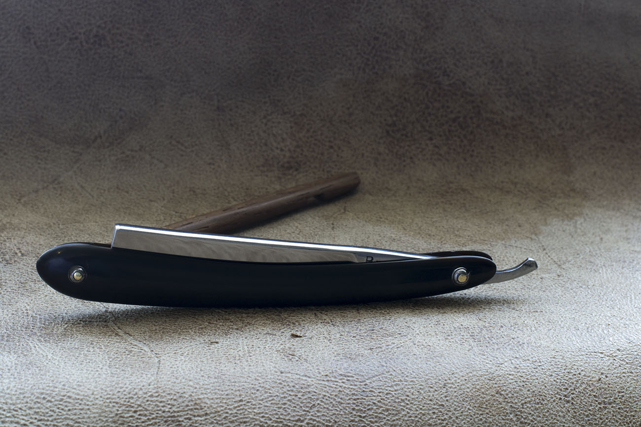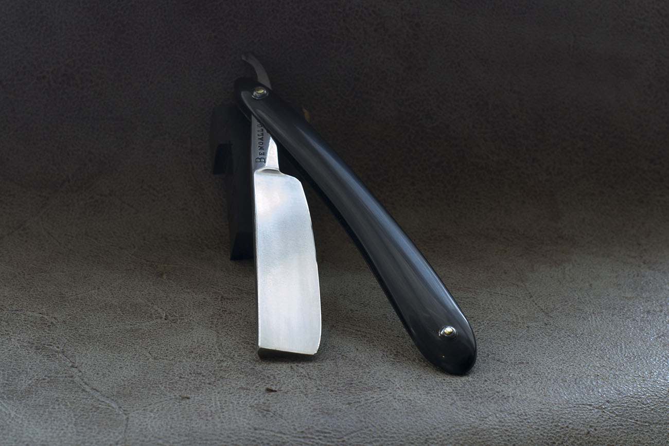 Миниатюрный, узкий полуклин от одного из известнейших производителей в Англии – Joseph Rodgers & Sons. Надпись на эрле свидетельствует о том, что Джозеф Роджерс являлся поставщиком Их Величеств Королей и Королев Англии. Хоть это и является лишь косвенным доказательством качества продукции данного производителя, но на деле все именно так – бритвы от Роджерса – прекрасны, сделаны из качественной углеродки, с завода имеют отличную геометрию, бреют чисто и мягко. Данная бритва получила новую рукоять из кости буйвола, имеет ширину в 5/8, вогнутость 1/2 , геометрия близка к заводской, фаска в районе режущей кромки тонкая и равномерная. Бритва прекрасно подойдет для окантовки усов, висков и бороды, а так же для бритья 1-3 дневной щетины. Заточена и готова к бритью. Продано Joseph Show