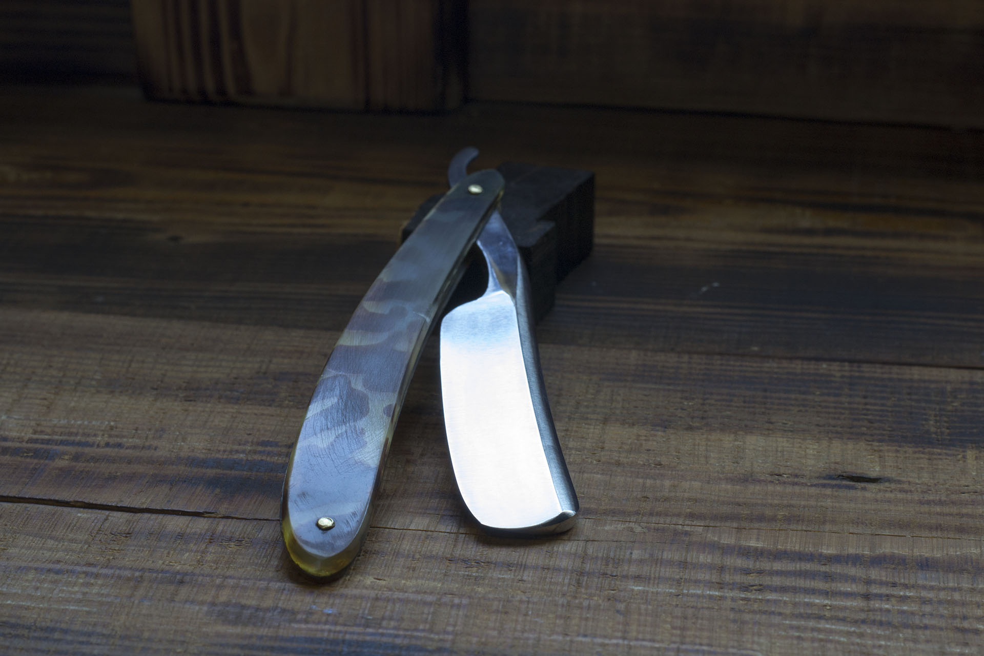 Старый клин, с прекрасной геометрией, изготовленный из качественной углеродистой стали во Франции. К сожалению период производства определить затруднительно, французы долгое время были приверженцами классических форм и подобные полотна выпускались до начала 20 века, но по косвенным признакам - форме родной рукояти и состоянию рога рискну предположить что это 70-80 гг 19 века. Бритва имеет крайне удобный эрль с подпальцевой выемкой, массивный широкий обух, ширина полотна 18.4 мм, отлично подходит для повседневного бритья и окантовки. Фаска режущей кромки тонкая и равномерная, свидетельство правильной геометрии полотна. Форма полотна уравномерно улыбчивая, что так же считаю несомненным плюсом. Бритва имеет новую роговую рукоять, изготовленную в соответствии с оригинальной, заточена и готова к бритью. Продано Volpiliere Fils. Show
