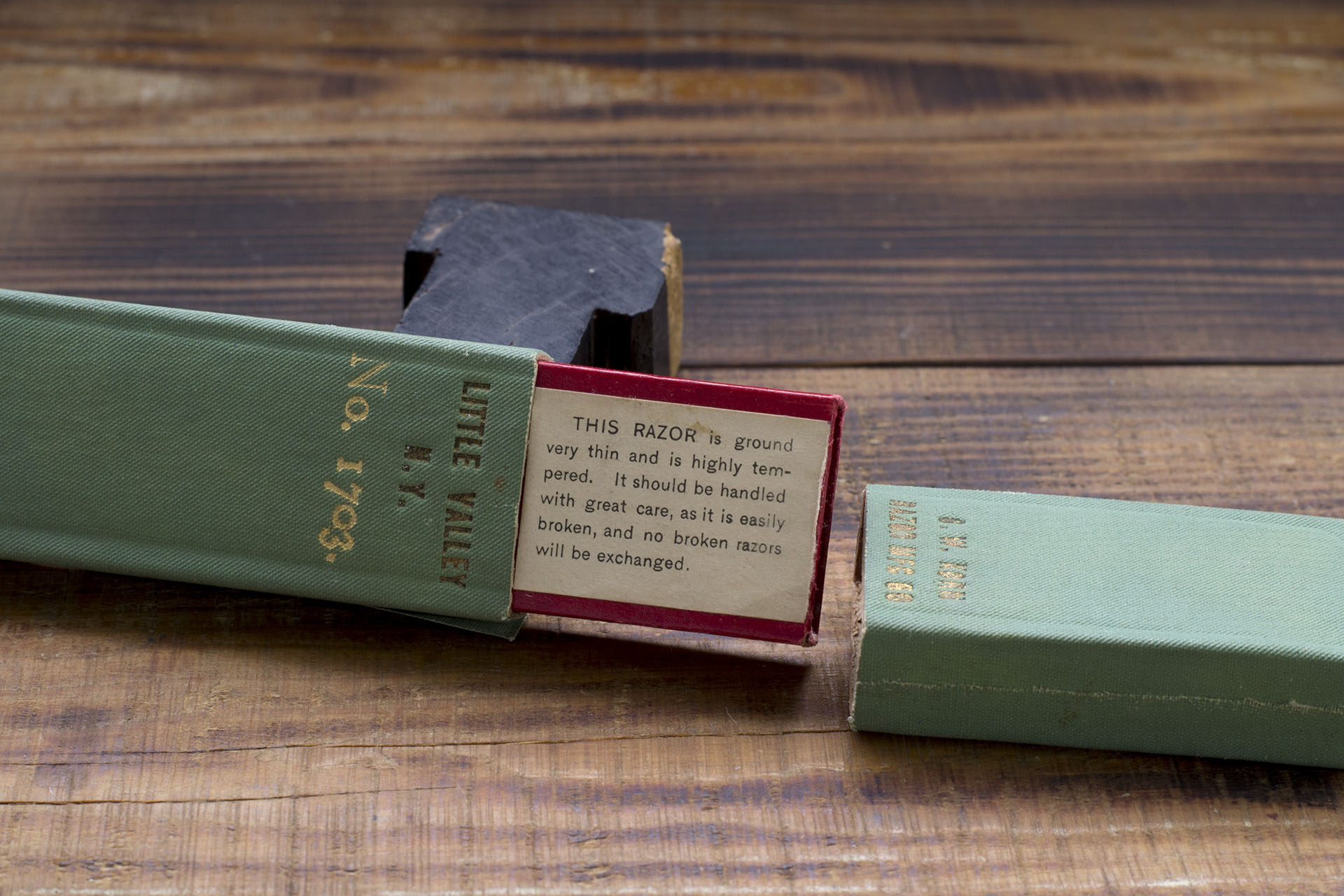 Опасная бритва начала 20 века, произведенная на предприятии Джорджа Уильяма Корна в Литл Вэлли, штат Нью-Йорк. Корн является довольно интересным и неординарным производителем, которому принадлежит ряд патентов в ножевом деле, а так же пара патентов на некоторые конструктивные особенности бритв. В частности на данном полотне применена технология American Double Hollow. По сути это хорошо известные бритвы с вогнутостью типа Bellied Hollow или "вогнутость с пупком" при которой на вогнутой части полотна бритвы отчетливо ощущается утолщение, полученное вследствие использования кругов двух разных диаметров при формировании вогнутости. Вещь действительно раннее известная и применяемая многими производителями, однако запатентовал ее именно Geo W. Corn. Так же к особенности полотна можно отнести его невероятную легкость и гибкость, бритва имеет очень тонкое и эластичное лезвие, которое может немного деформироваться при бритье, повторяя конутры лица. Об этом так же свидетельствует этикетка на коробке бритвы. Так же стоит упомянуть очень удобный эрль, отлично сидит в руке. Трудно сказать была ли бритва в использовании, я удалил коррозию с эрля, возможно туда просто попала влага, а вот кромка бритвы не была сведена окончательно, вероятно это заводская заточка, при которой лишь намечают режущую кромку не затачивая бритву до готовности. В комплекте так же родной футляр в состоянии нового. Ширина полотна 18 мм, родная рукоять из эбонита. Отлично подойдет для новичка. Заточена и готова к бритью. Продано Spoiler Show