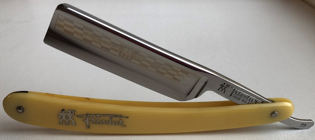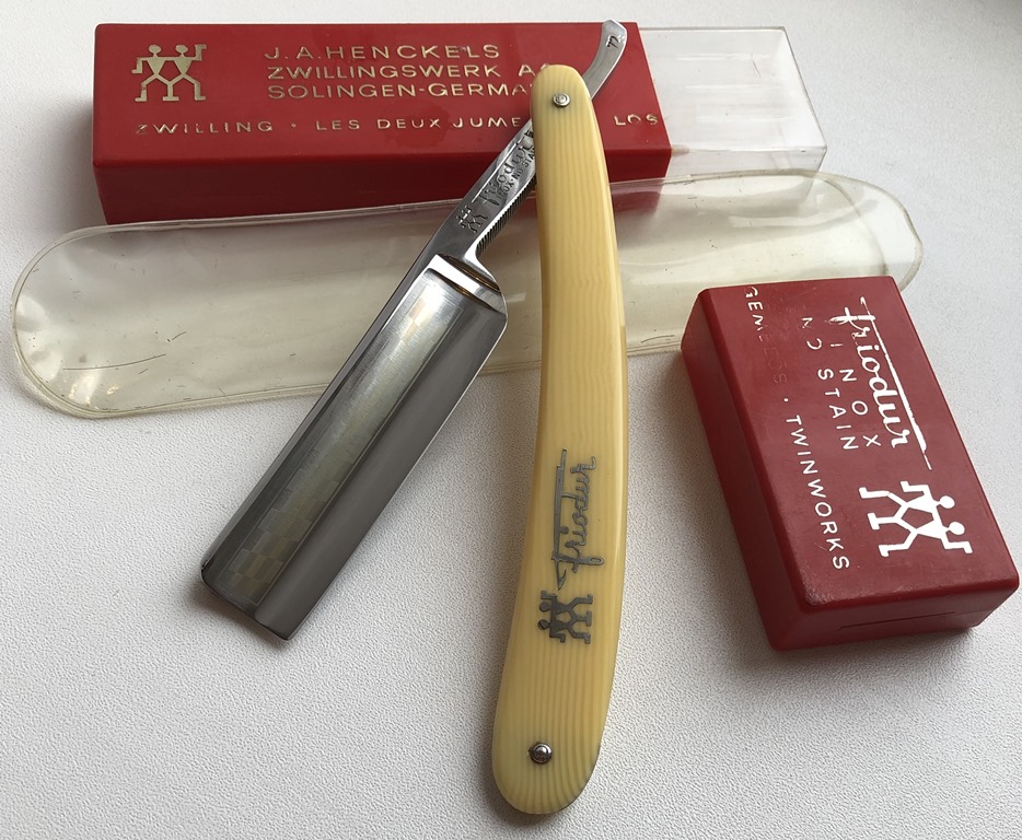 Все 4 бритвы разных моделей, в состоянии идеальное или близкое к идеальному... Непользованный J.A.HENCKELS.SOLINGEN ZWILLINGSWERK модель 72 Ширина полотна-20 мм Толщина обушка-5.8 мм Полная вогнутость. Сталь условно нержавеющая-FRIODUR INOX Бритва не разбиралась и не ремонтировалась, не имеет следов пользования.Заводская шлифовка и полировка. Полотно без царапин, следов окисления и других дефектов.(немного сошла синяя краска с букв на полотне, но это не принципиально).Идеальная геометрия клинка:кромочка равномерна по всей длине и еле заметна.Заточена и готова к бритью. Цена-9500 р с доставкой. ПРОДАН Spoiler Show