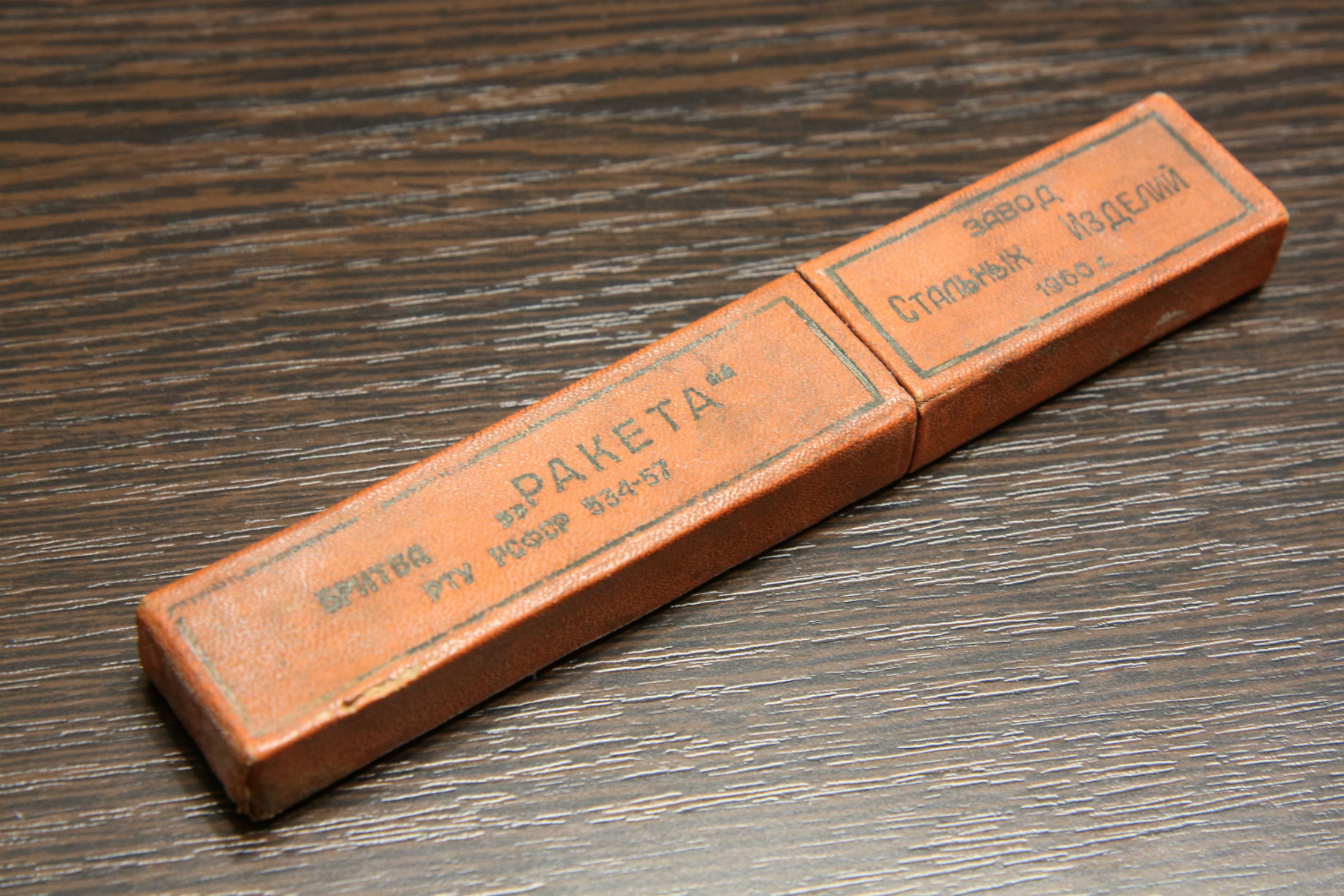Продается от skvaterПРОДАНО 46) Опасная бритва Ракета СТИЗ 60 г ПРОДАНО  Опасная бритва Ракета, завод СТИЗ, 1960 год. Ширина полотна 15 мм, все родное, футляр тоже. Ко мне попала в коррозии, почистил вручную (остались некоторые следы) и подготовил к бритью. Ракеты считались качественными бритвами и были довольно дороги (4 рубля). Сталь звонкая, твердости чуть выше средней, чем то немцев напоминает. Цена - руб. К бритве рекомендую приобрести ремень для правки опасных бритв моего изготовления из итальянской кожи (подробнее на странице 4, объявления 56-58). Spoiler Show