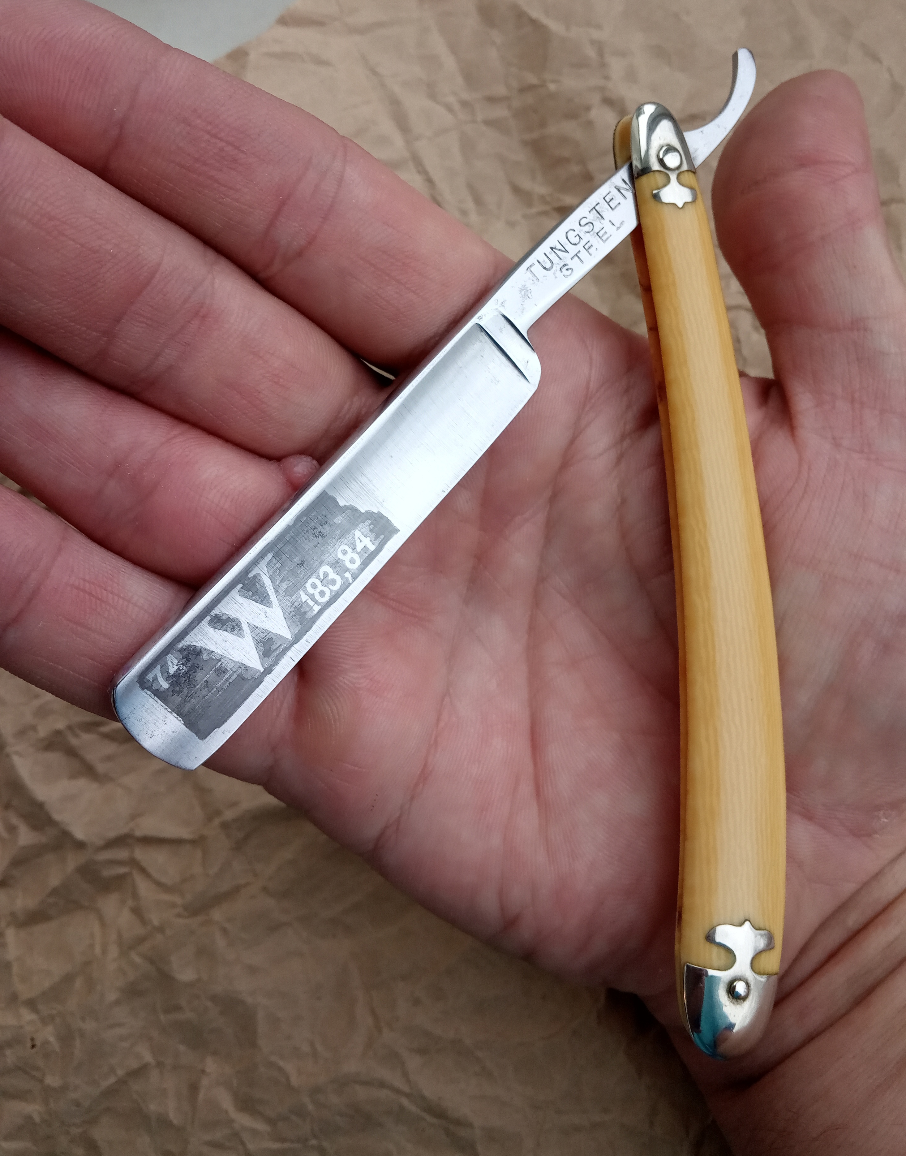 А что плохого в том, что бритву привели "в порядок" и сделали из неё рабочий инструмент? Но, в процессе регринда были стерты все надписи на полотне. Идеальная реставрация, в моем понимании - восстановление всего до мелочей. Травление на полотне - одно из них.