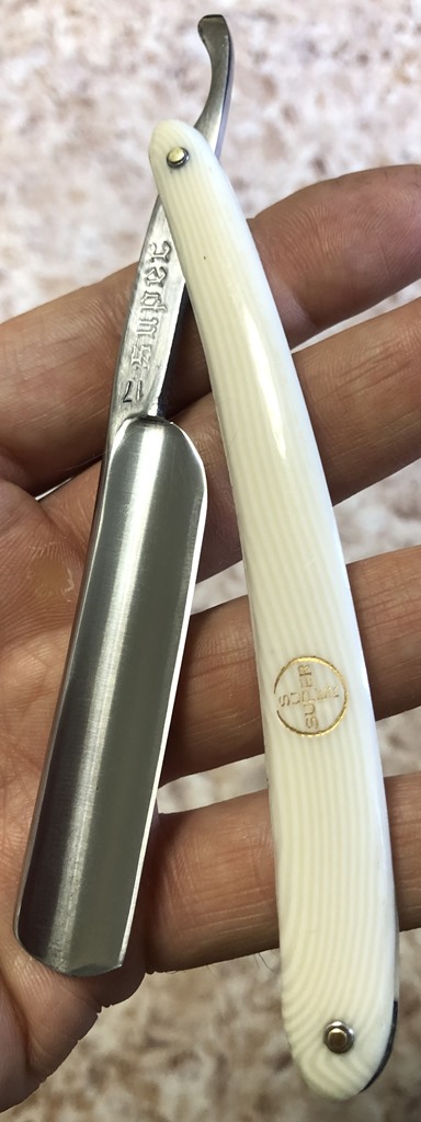 Очень долго лежали у меня две бритвы,на которые я совершенно не обращал внимания, по причине того, что чисто интуитивно они мне не понравились, а визуально сталь клинков показалась мне какой то странной. Но, недавно решил ими заняться и, честно скажу, в этот раз опыт и интуиция меня подвели. Помимо того, что обе бритвы были совершенно непользованными,но со "следами времени", то и сталь прекрасно точилась, доводилась на тонких натуральных абразивах, естественно с прохождением всевозможных тестов. Но, самое главное, первое бритье превзошло все мои ожидания. (обычно, когда у меня есть вопросы и сомнения по поводу той или иной бритвы, то после заточки, на момент бритья, беру с собой ещё одну проверенную бритву,чтобы нормально завершить процесс и не мучить себя некачественным бритьём).Бритье показалось близкое к эталонному, без каких либо неудобств, раздражений и прочих неприятных ощущений. К тому же, сама бритва имеет средний размер и по многим показателям идеально подойдет для новичка,ну а для опытного товарища вообще говорить не приходится. Так как первая бритва так и не дошла до моей темы продаж и была сразу продана, то представлю второй экземпляр.