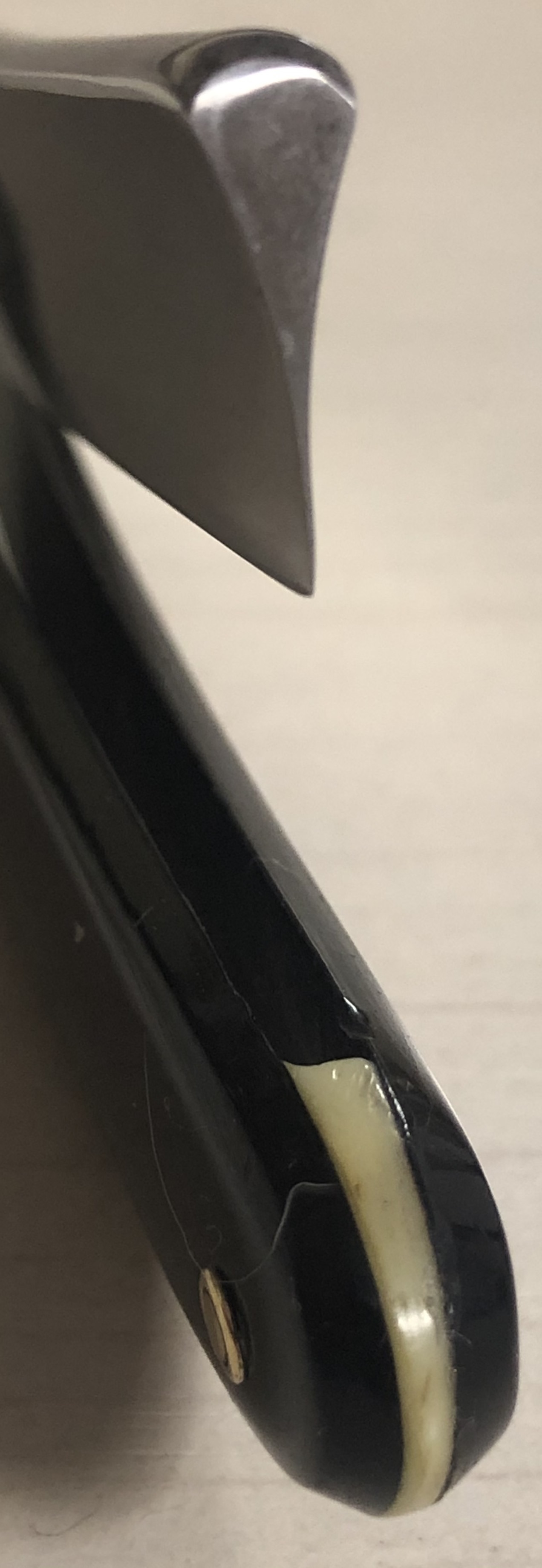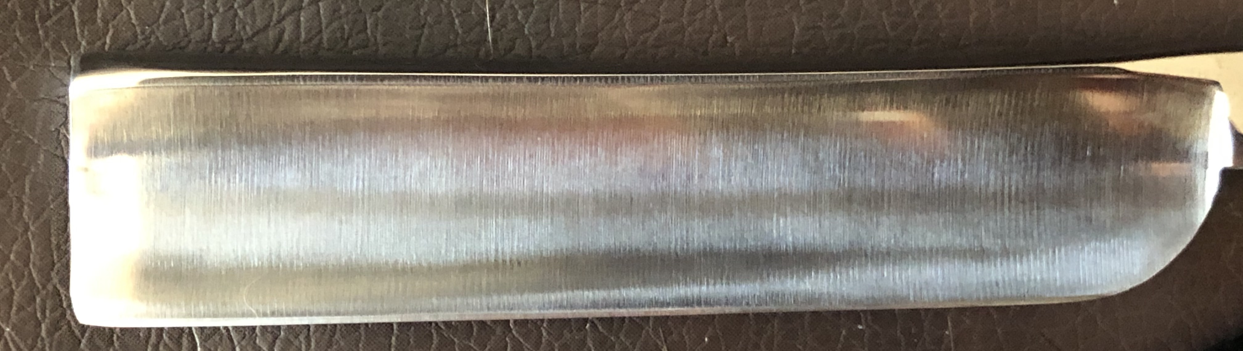 По всей видимости бритва в пользовании не была,судя по отсутствию следов от заточных камней на обушке, но была подвержена неправильной попыткой заточки, о чем говорят штрихи на лицевой стороне полотна.Это место немного полирнул, а обратную сторону клинка перешлифовал и также отполировал. Заменил пины и убрал окисление и патину в районе осевого пина.Сталь чистая, без видимых дефектов.Идеальная геометрия полотна. Заточена и готова к бритью. Коробочка, естественно неродная, зато пролетарского цвета, соответствующая духу того времени.
