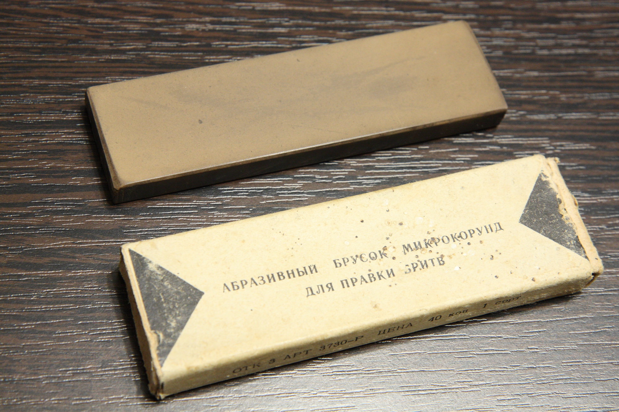 Абразивный брусок микрокорунд для правки опасных бритв (по факту для этапов заточки в районе 3000 грит), но так же отлично подойдет для правки/подточки ножей, сделан в СССР. Работает с водой, одну сторону подготовил к работе на порошках до F400. Размеры 120х35х10 мм, родная коробочка. Бритва лежит для масштаба и не продается. Цена - руб.