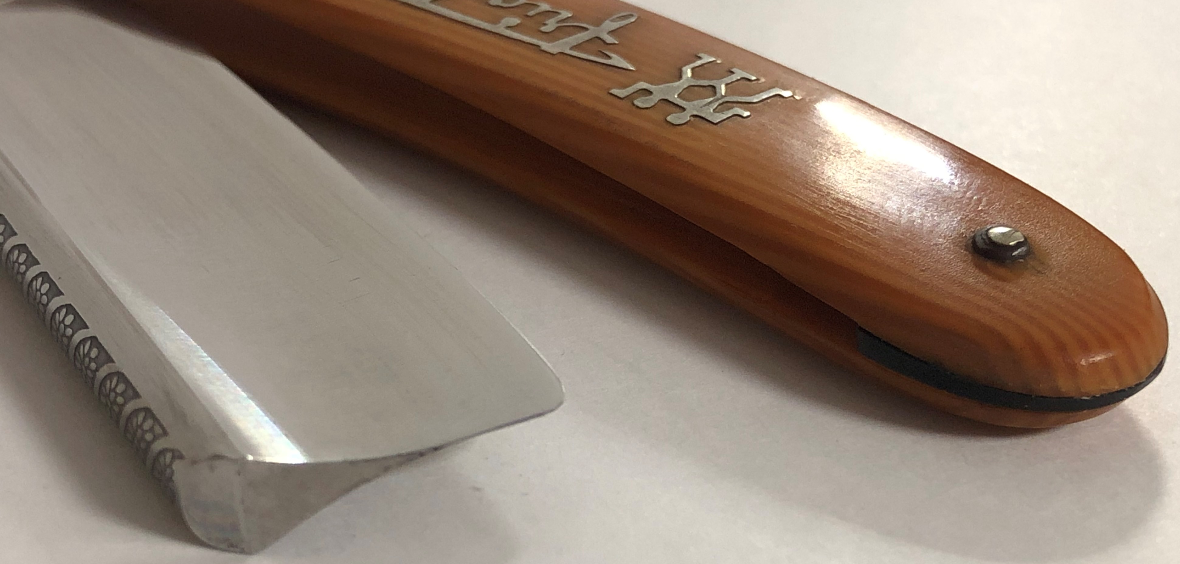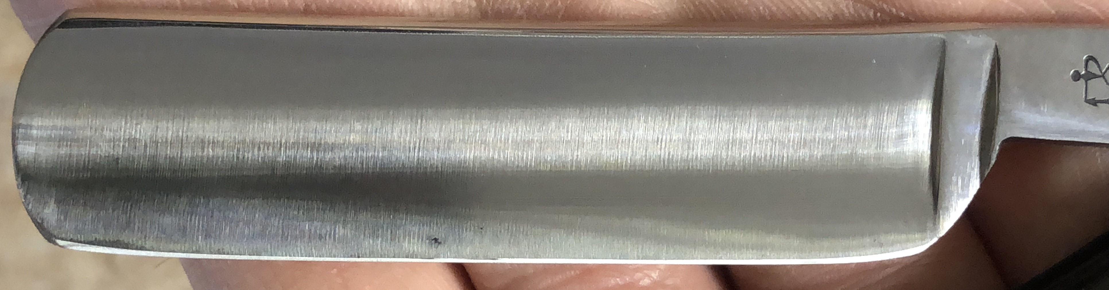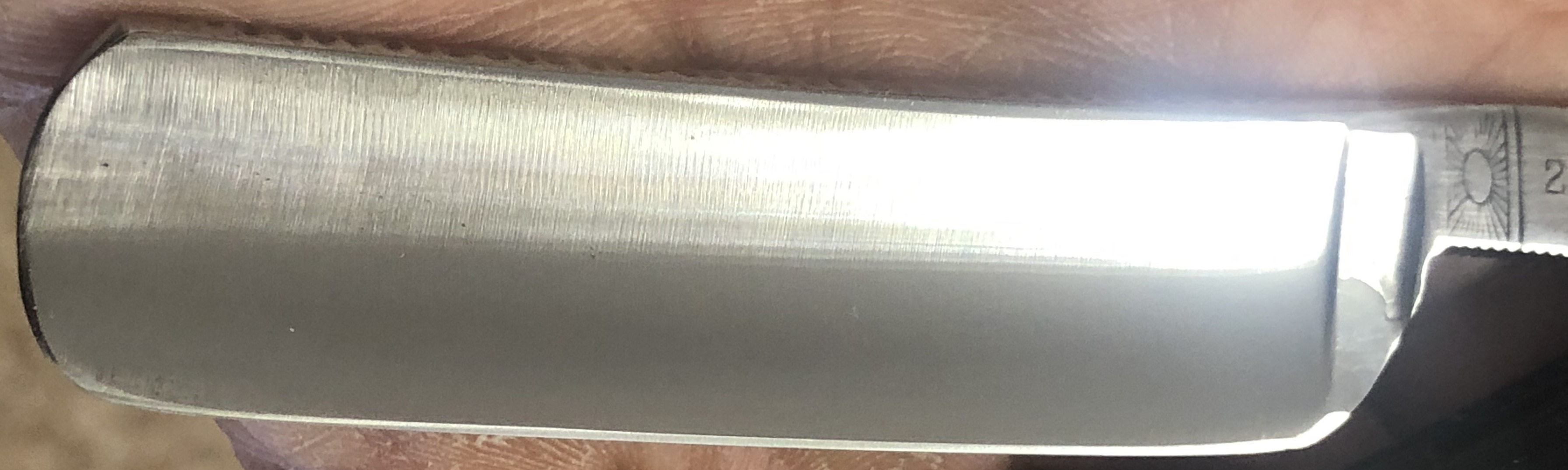 Клинок в очень хорошем состоянии, без следов активного пользования.Родную оправу оставил до лучших времен и установил вот такую, эффектную ручку(от другого старинного донора), тем более что она вошла в аккурат по размеру клинка.Красивая, трёх-пиновая оправа.Два крайних пина заменил на двух-цветные немецкие втулки, с добавлением внутренних шайб. Само лезвие немного освежил , но оставил немного следов патины в районе эрля, для придания более естественного вида.Идеальная геометрия полотна:кромочка равномерна пов сей длине. Сталь и кромка чистые от разного рода видимых дефектов. Заточена и готова к бритью.
