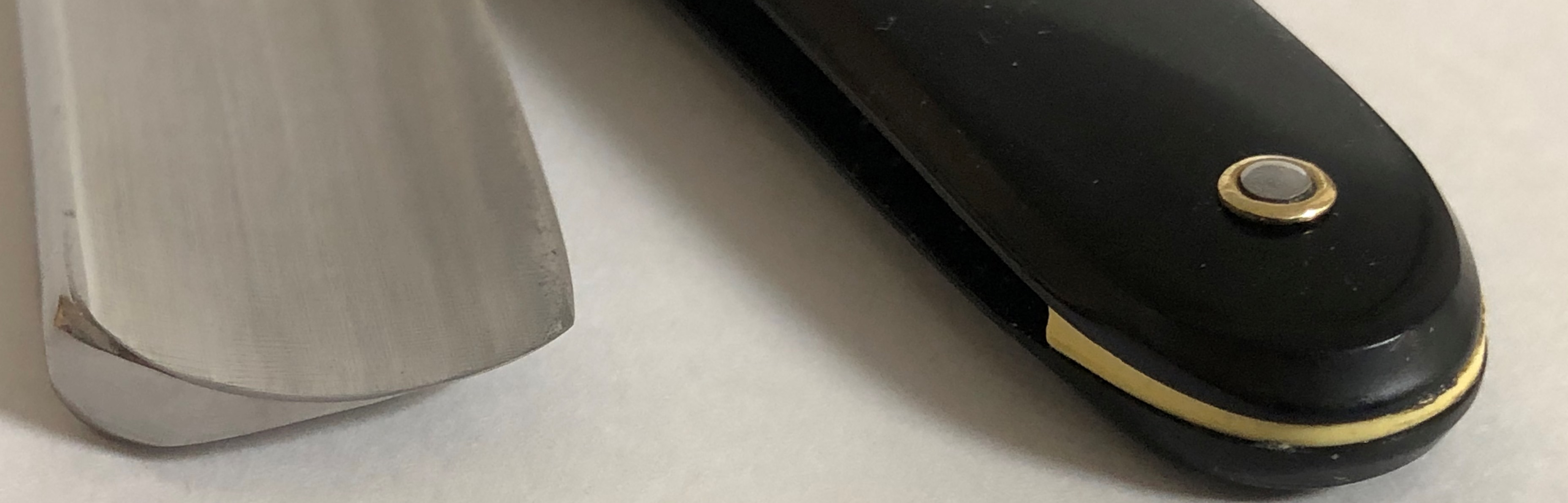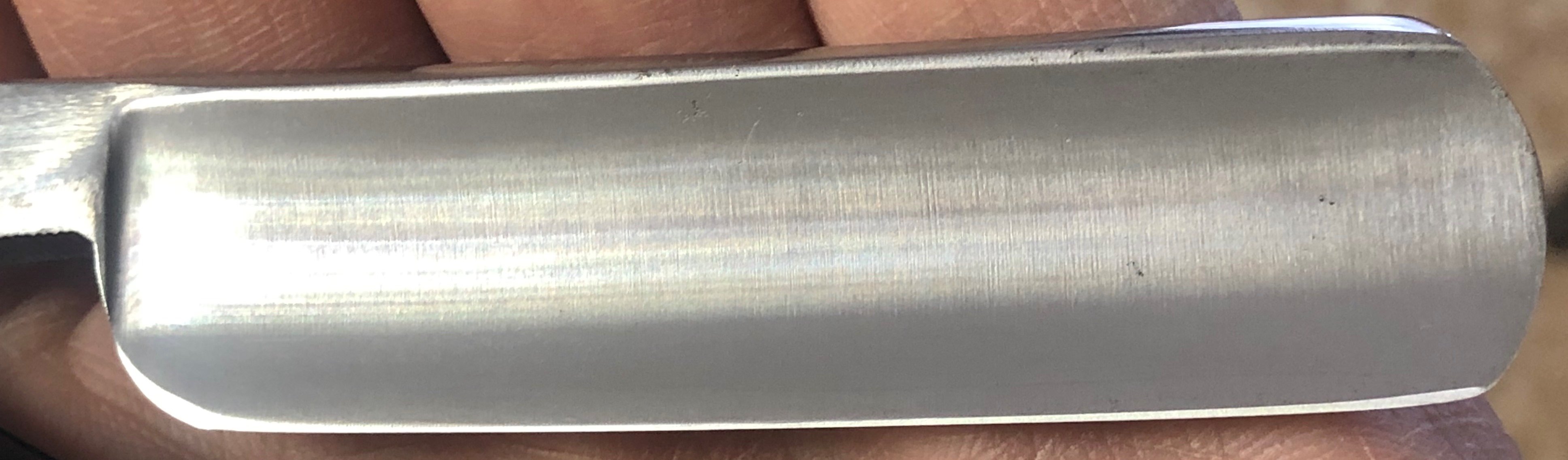 Следов пользования не обнаружено.Разобрал, немного освежил клинок от патины и заново собрал, сохранив оригинальный осевой пин. Идеальная геометрия изготовления. Кромочка равномерна по всей длине. Сталь и кромочка чистые от разного рода дефектов. Форма лезвия и размер бритвы очень хорошо подойдет для новичков и не только.Заточена и готова к бритью.