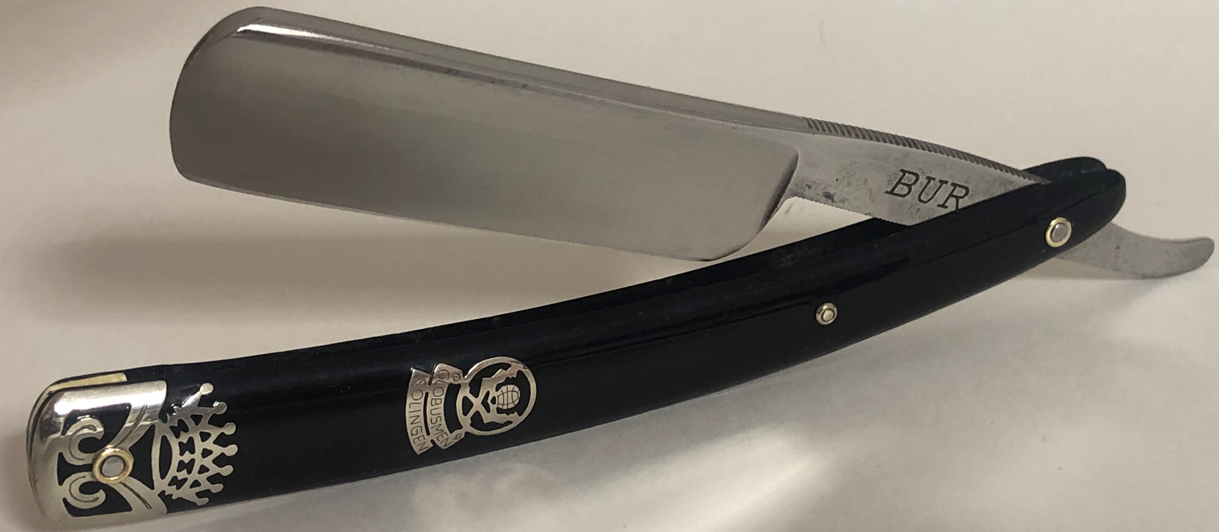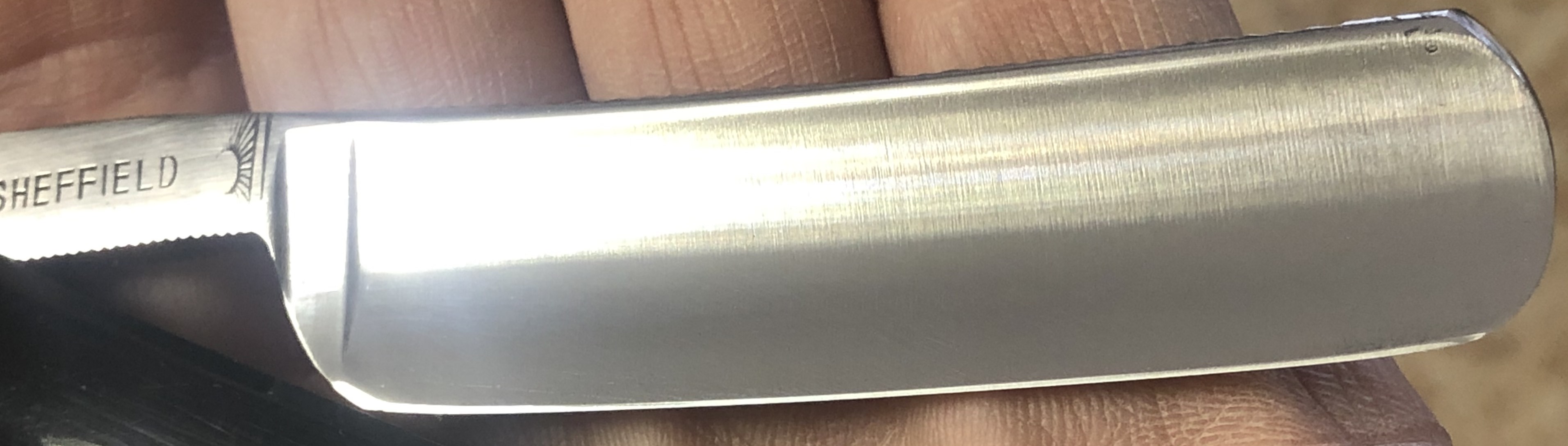 Клинок в очень хорошем состоянии, без следов активного пользования.Родную оправу оставил до лучших времен и установил вот такую, эффектную ручку(от другого старинного донора), тем более что она вошла в аккурат по размеру клинка.Красивая, трёх-пиновая оправа.Два крайних пина заменил на двух-цветные немецкие втулки, с добавлением внутренних шайб. Само лезвие немного освежил , но оставил немного следов патины в районе эрля, для придания более естественного вида.Идеальная геометрия полотна:кромочка равномерна пов сей длине. Сталь и кромка чистые от разного рода видимых дефектов. Заточена и готова к бритью.