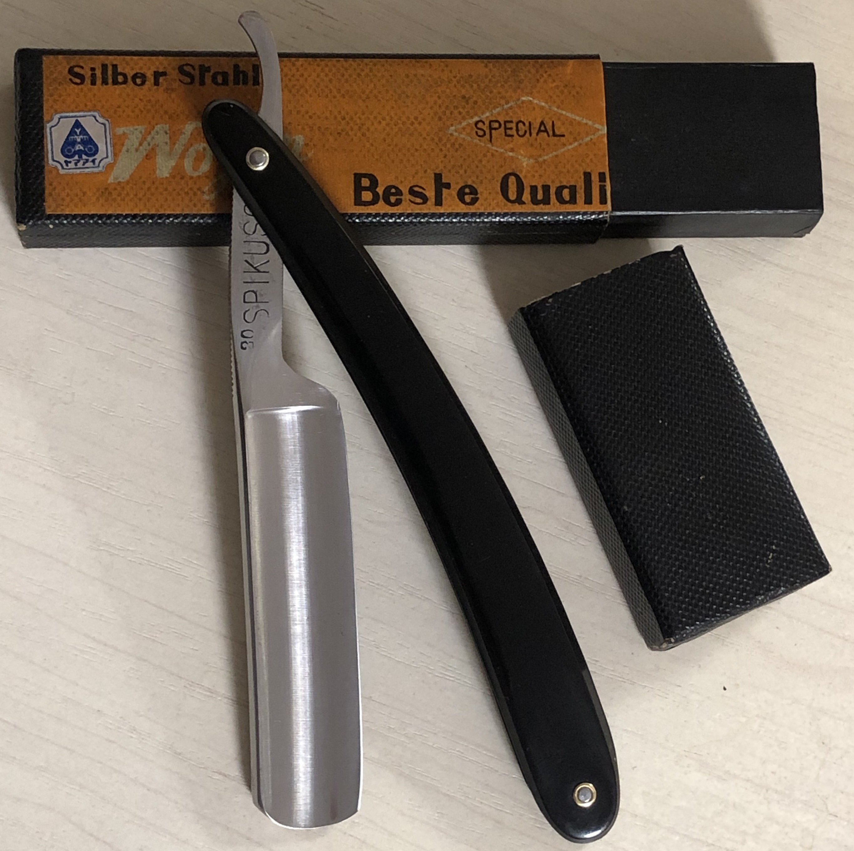 Бритва в прекрасном состоянии для своих лет, без видимых следов пользования. Разобрал, немного освежил клинок и снова собрал, заменив пины на немецкие втулки.Идеальная геометрия полотна:кромочка равномерна по всей длине и еле заметна.Сталь чистая от разного рода дефектов.Красивая и удобная форма бритвы будет отличным вариантом для новичка, а"серебряная" сталь(как одна из самых удачных на бритвах) способна выдавать очень качественное и мягкое бритьё. Заточена и готова к бритью.