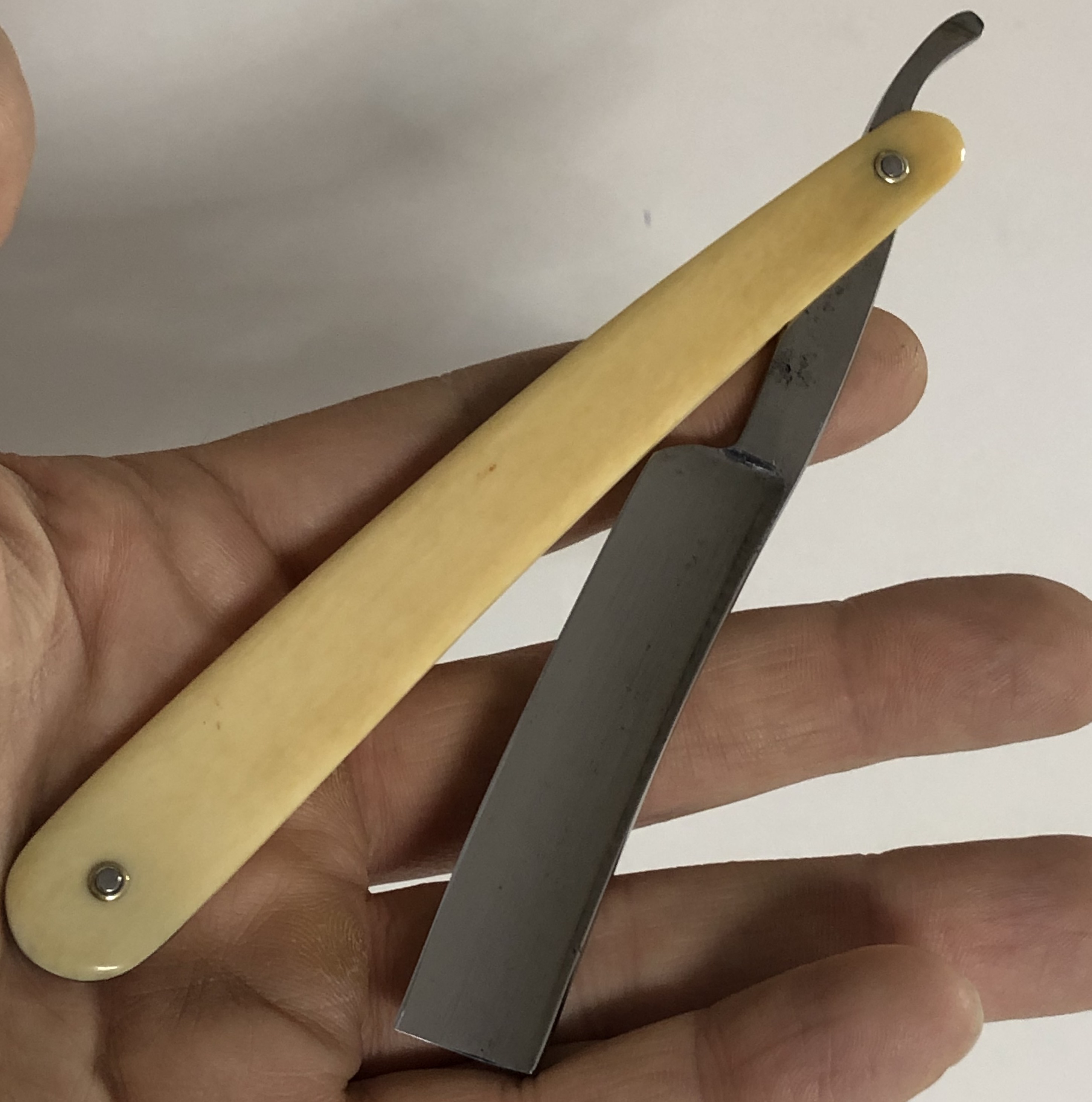 Клинок в очень хорошем состоянии, без следов от заточных камней на обушке.По всей видимости в пользовании не была.Немного следов патины на полотне убирать не стал, чтобы не трогать заводскую шлифовку и полировку.(На фото следы видны, а вот наяву практически незаметны). Кромочка равномерна по всей длине.(Небольшую горбинку в районе носика тоже трогать не стал, чтобы не стачивать лишний металл. Возможно заводской нюанс).Шикарная оправа из натурального бивня слона, с красивой структурой материала, находится в идеальном состоянии, без трещин и сколов и как раз очень подходит для такого именитого клинка. Бритва среднего размера, элегантная и удобная. Опытный пользователь способен в полной мере оценить данную модель, заточенную и в максимально сохраненном оригинальном виде.